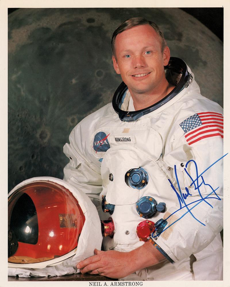 Sought-after color 8 x 10 NASA lithograph of Armstrong posing in his white space suit against a lunar backdrop, beautifully signed in blue felt tip. In very good to fine condition, with a full-length vertical bend that passes through Armstrong's face and image. An attractive, uninscribed example of this iconic NASA portrait.