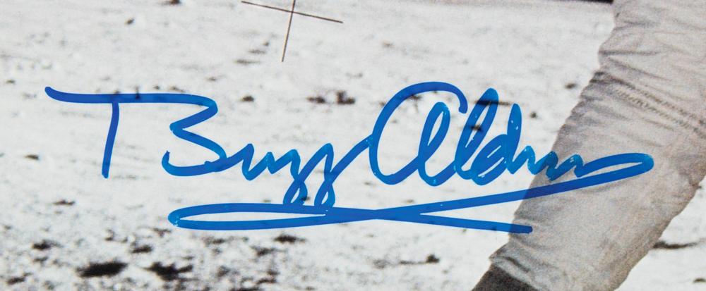 Appealing color 16 x 20 glossy photographic print by Aerographics of Buzz Aldrin descending the ladder of the Lunar Module Eagle during the Apollo 11 mission, signed in blue felt tip by Buzz Aldrin. In very fine condition.