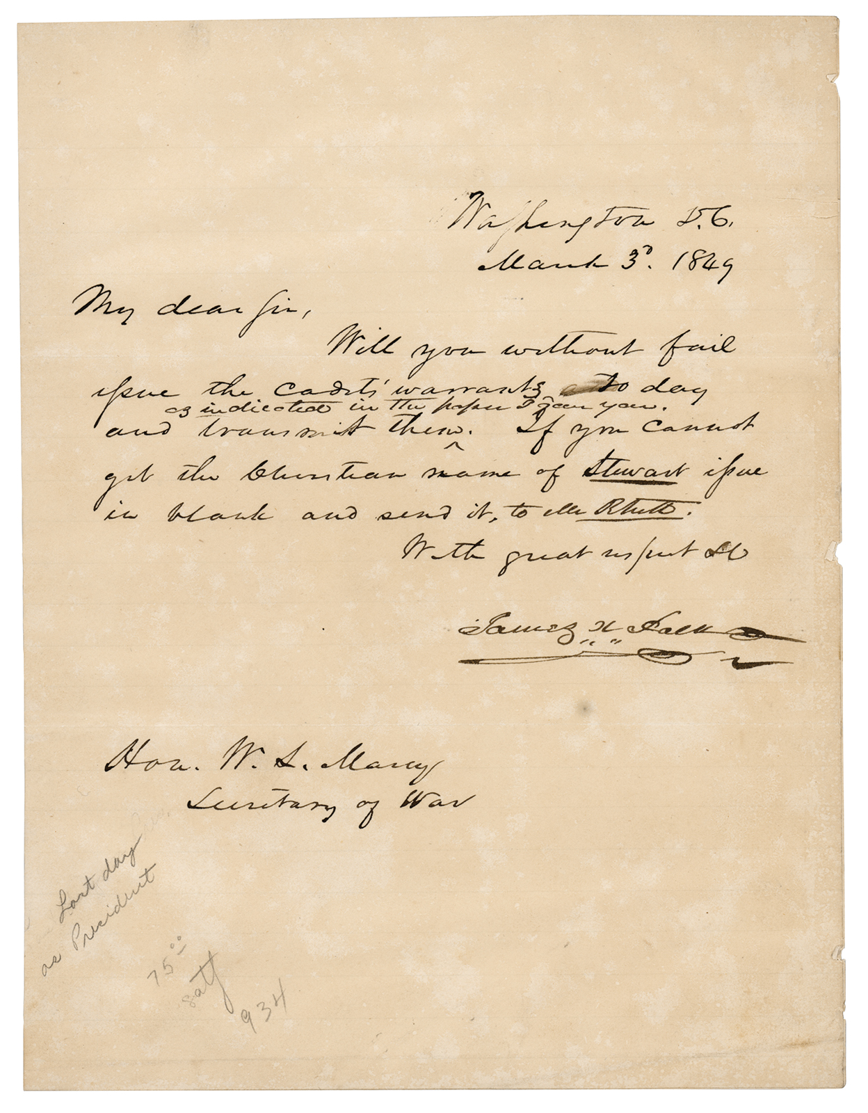 ALS as president, one page, 7.5 x 10, March 3, 1849. Addressed from Washington, a handwritten letter from James K. Polk sent to his Secretary of War, William L. Marcy, in full: “Will you without fail issue the cadets’ warrants today and transmit them as indicated in the paper I gave you. If you cannot get the Christian name of Stewart issue it blank and send it, to Mr. Rhett.” In very good to fine condition, with overall wrinkling, rippling, and slightly irregular toning. An appealing piece of correspondence from the president to a cabinet member, penned by Polk on the last full day of his presidency.