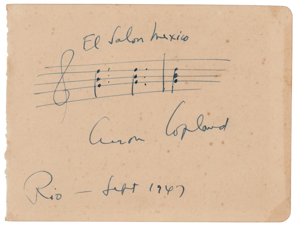 AMQS on an off-white 5.75 x 4.5 album page, signed below in fountain pen, "Aaron Copland, Rio—Sept. 1947." Copland pens three chords from "El Salon Mexico," symphonic composition in one movement. In fine condition, with scattered light foxing.