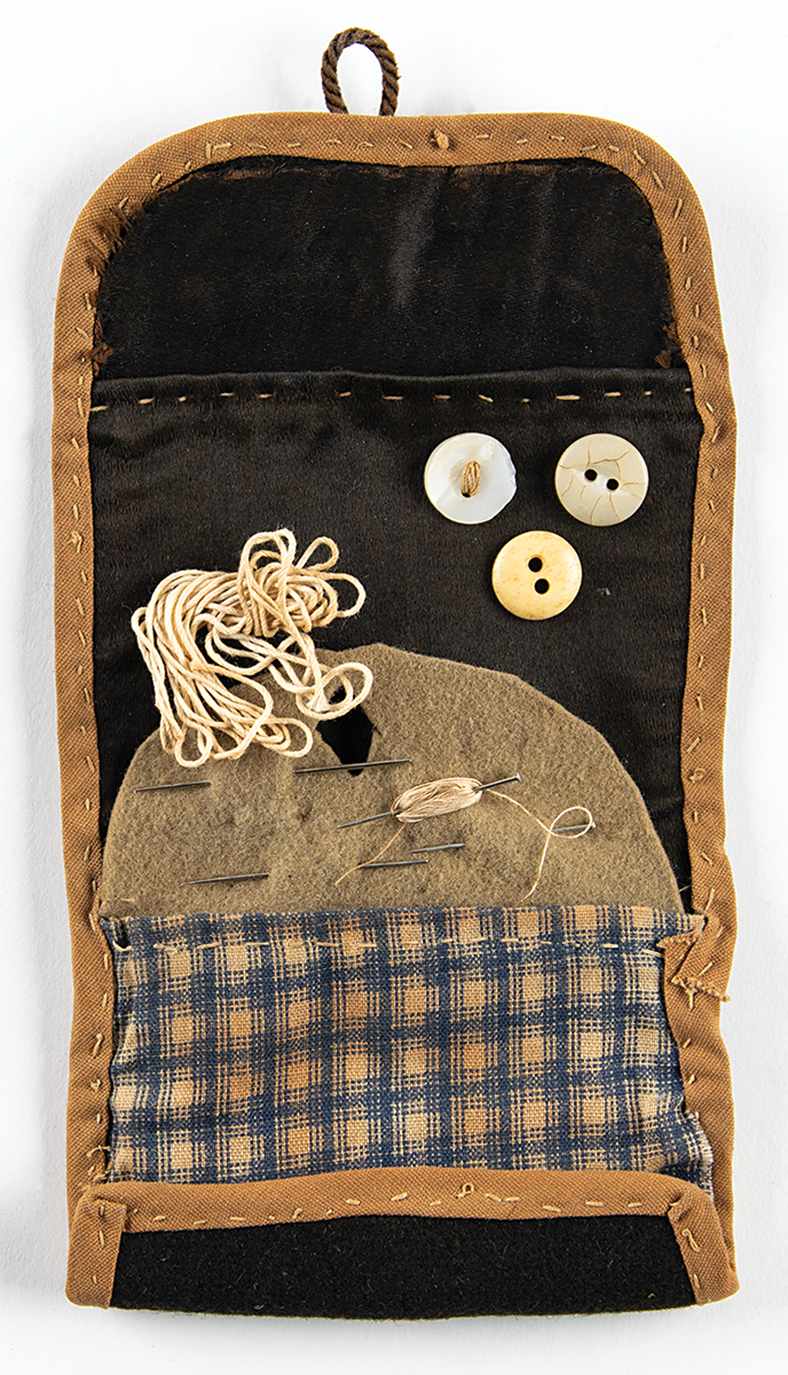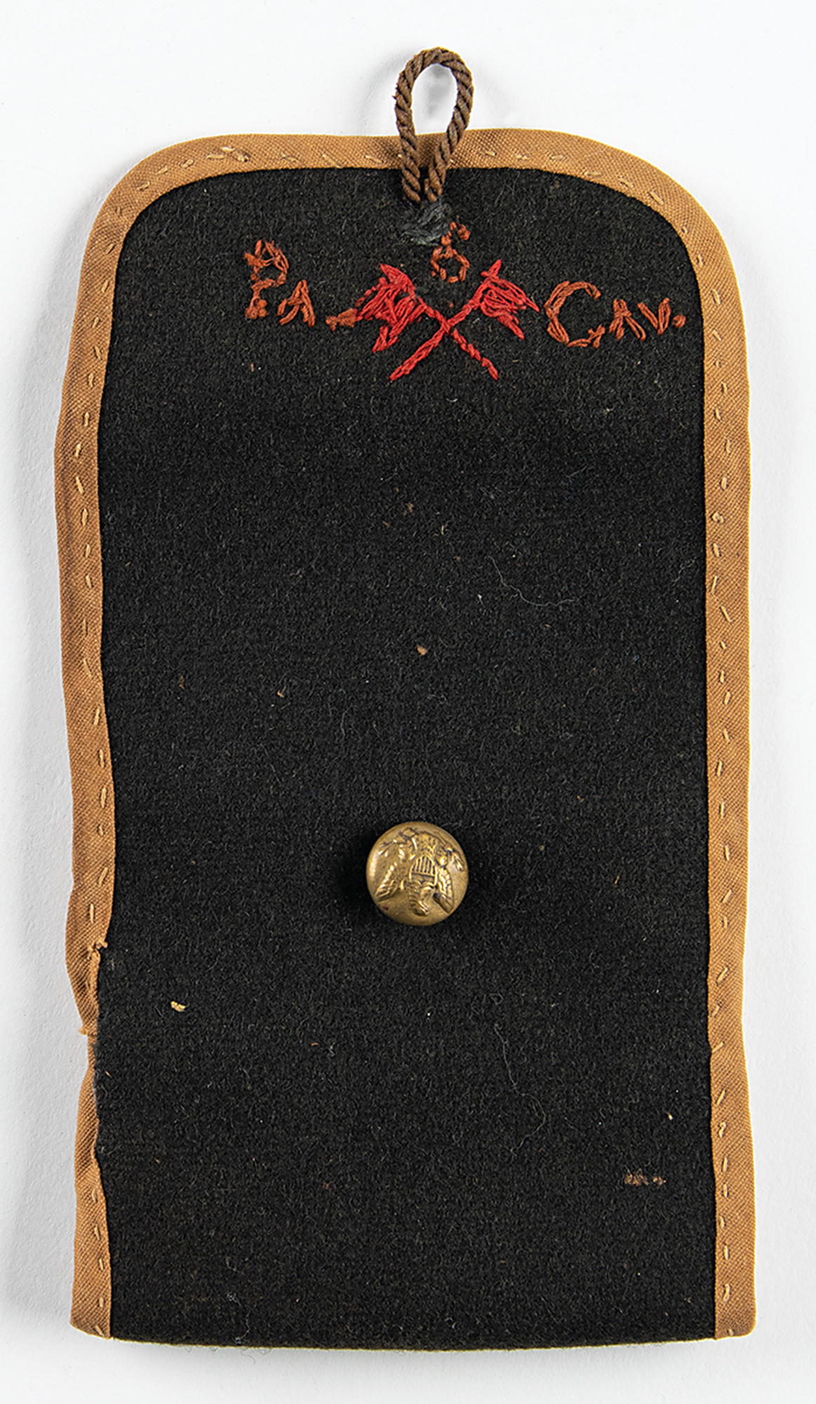 Civil War-era 'housewife' sewing kit affiliated with the 6th Pennsylvania Cavalry Regiment, famously called 'Rush's Lancers,' as they were known for their early use of 9-foot lances in combat. The kit measures 3.5″ x 7.25″ open, and holds thread, stitching needles, and three small buttons. The closure flap is hand-stitched, "Pa. 6th Cav.," and has a loop that could be secured around the brass Union eagle button sewn to the back. In very good to fine condition.