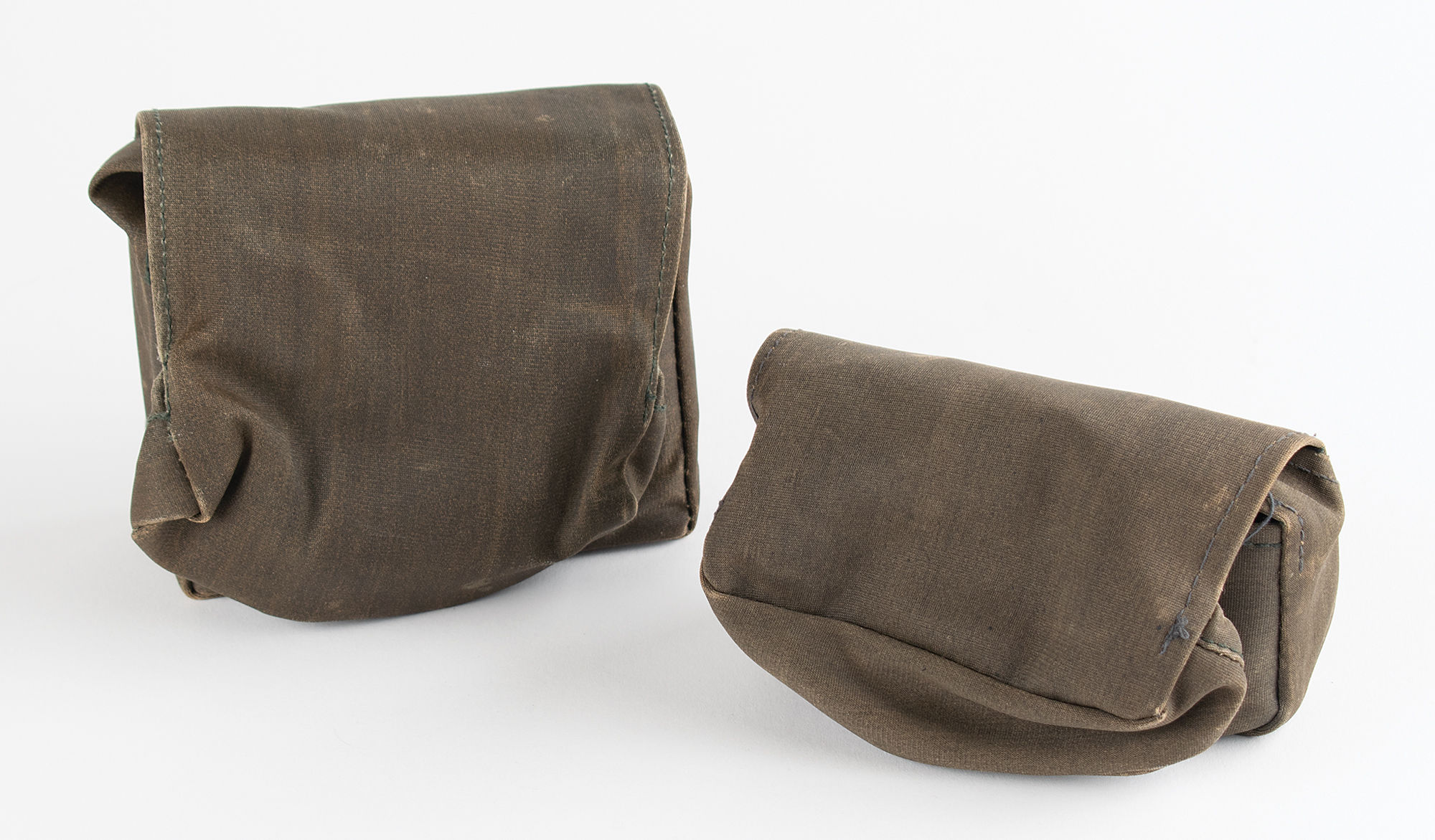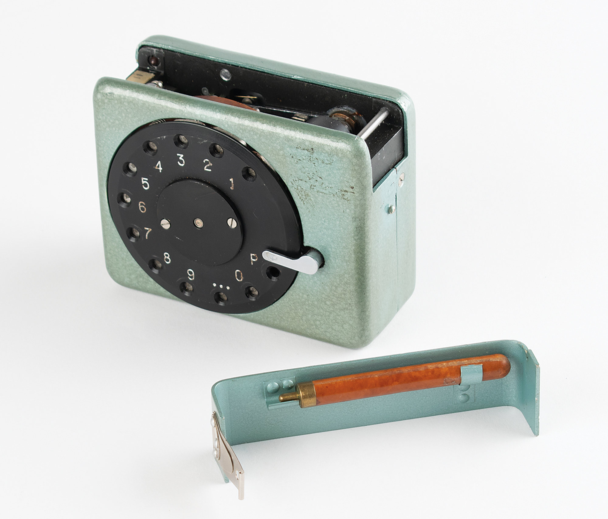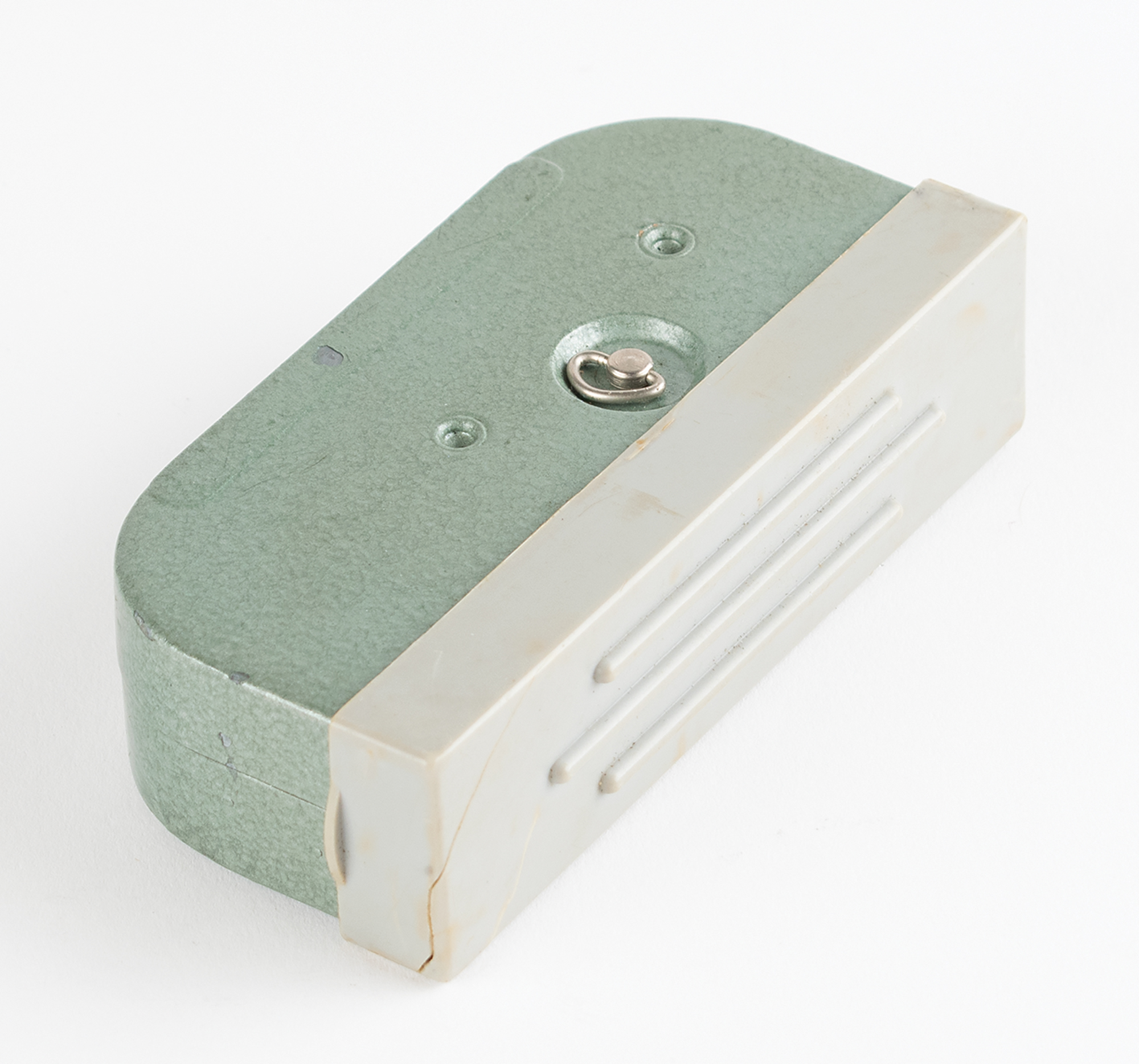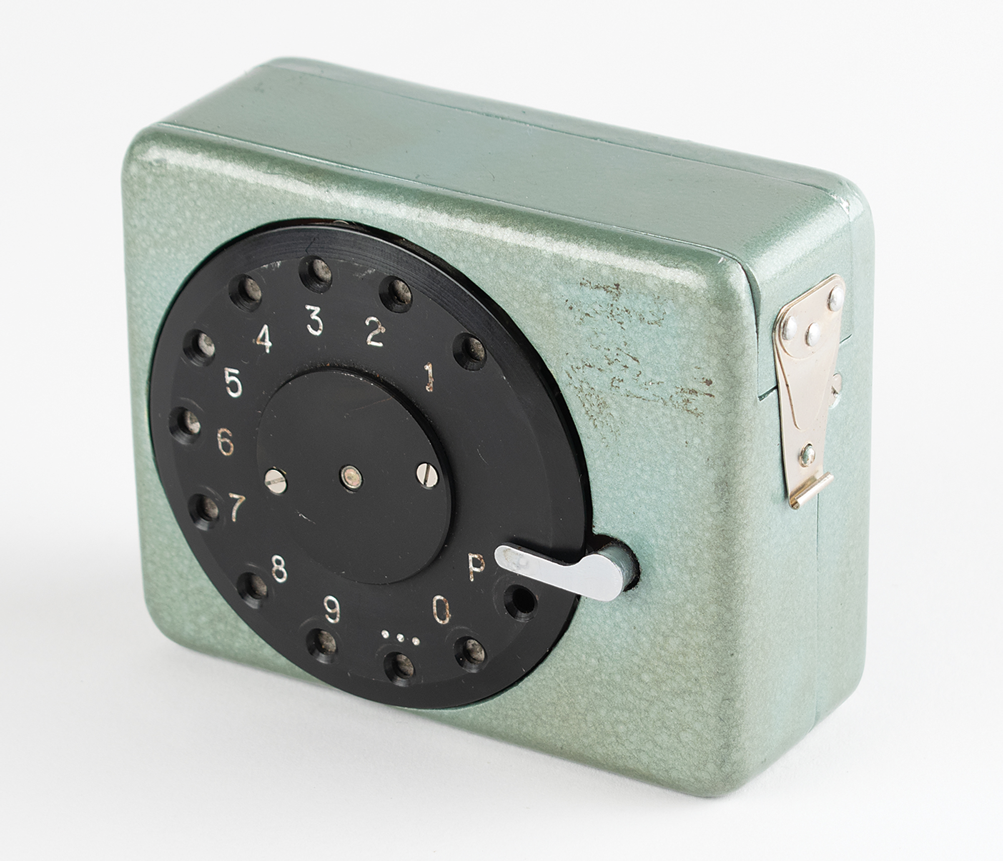 R-353 Proton burst encoder and magnetic tape cassette, introduced in the Soviet Union in 1969 as part of the R-353 spy radio set. The burst encoder measures approximately 4″ x 3″ x 1.5″, and features a central black number dial similar to a rotary phone. Using a stylus stored inside the lid to rotate the dial, a message would be encoded onto magnetic tape. The tape cartridge measures 4″ x 2″ x 1″ and has two small fold-out cranks for winding the tape on its internal spools. Both pieces are painted in the original green/blue hammerite paint, one of two colors used for the R-353 Proton spy radio set. Both include their canvas transport bags.
