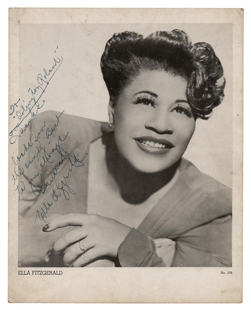 Vintage cardstock 8 x 10 publicity photo of Lady Ella in a lovely up-close pose, signed and inscribed in fountain pen, "To 'Arlington Roland,' Thanks loads for the candy, Best to you always, Sincerely, Ella Fitzgerald.” In fine condition, with scattered light soiling.