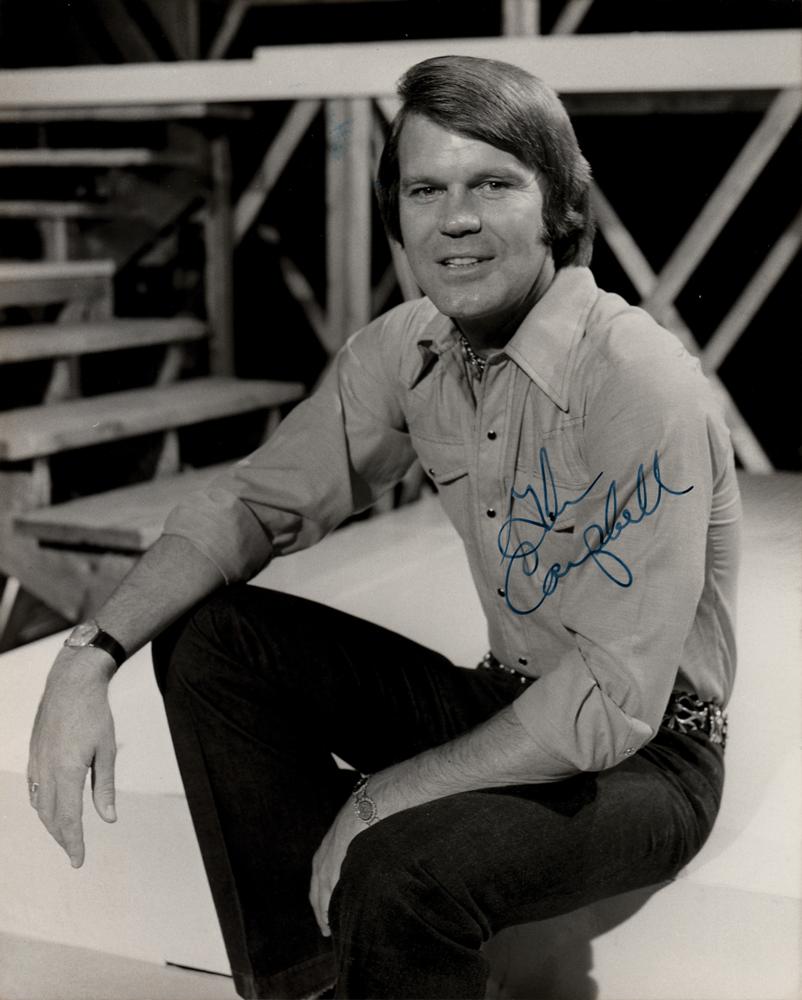 Glossy 8 x 10 photo of the 'Rhinestone Cowboy' singer in a handsome seated pose, signed in blue ink by Glen Campbell. In fine condition.