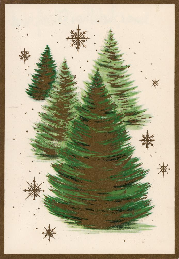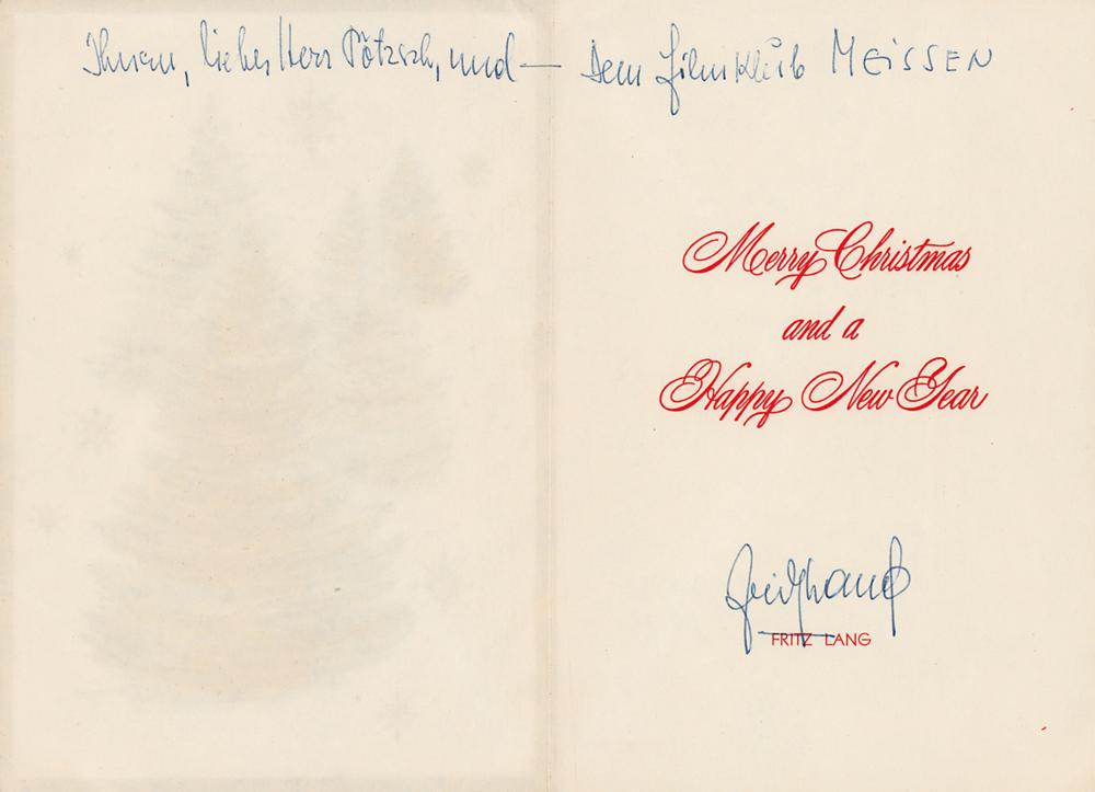 Personal Christmas card from Fritz Lang with an attractive snowflake and tree design to the front, measures 10.75 x 7.75 open, signed inside in blue ballpoint by Lang, who adds an inscription in German to the upper portion. In fine condition.