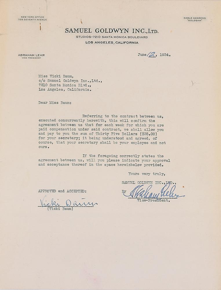 Austrian-born Jewish writer (1888-1960) best known for her 1929 work, People at a Hotel, which was made into the Academy Award-winning film Grand Hotel, starring Greta Garbo. Scarce DS, one page, 8.5 x 11, June 12, 1934. Agreement between Baum and Samuel Goldwyn Inc. stating that the studio will pay Baum's secretary's salary of $35 per week while Baum is under contract; the secretary will remain Baum's employee, not the studio's. Signed at the conclusion by Baum and countersigned by Abraham Lehr as vice president of Samuel Goldwyn Productions. In fine condition, with a rusty paperclip impression to the top edge. Baum wrote more than 50 novels throughout her career, several of which were adapted into motion pictures. A rare document from the woman considered by many to be one of the first modern best-selling authors—only the third Baum we have offered.