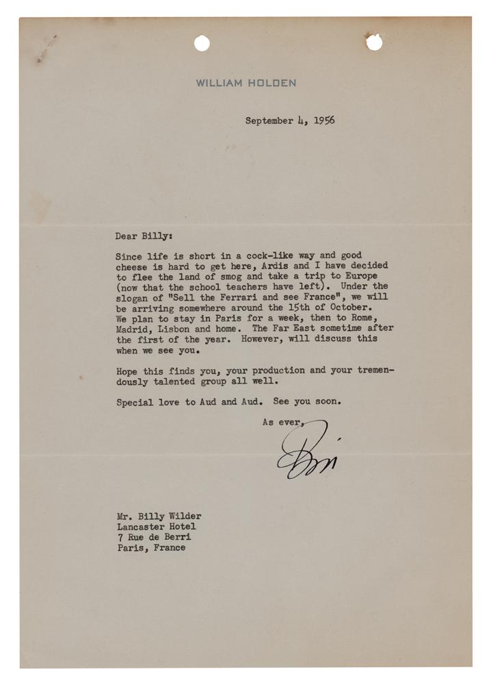 TLS signed “Bill,” one page, 7.25 x 10.25, personal letterhead, September 4, 1956. Letter to friend and director Billy Wilder, in full: “Since life is short in a cock-like way and good cheese is hard to get here, Ardis and I have decided to flee the land of smog and take a trip to Europe (now that the school teachers have left). Under the slogan of ‘Sell the Ferrari and see France,’ we will be arriving somewhere around the 15th of October. We plan to stay in Paris for a week, then to Rome, Madrid, Lisbon and home. The Far East sometime after the first of the year. However, will discuss this when we see you. Hope this finds you, your production and your tremendously talented group all well. Special love to Aud and Aud. See you soon.” In fine condition, with file and staple holes to the top edge. Given the date, Wilder’s Parisian address, and the mention of “Aud,” the ‘production’ in question is most certainly for the 1957 film Love in the Afternoon, which was set in Paris and starred Gary Cooper, Audrey Hepburn, and Maurice Chevalier.