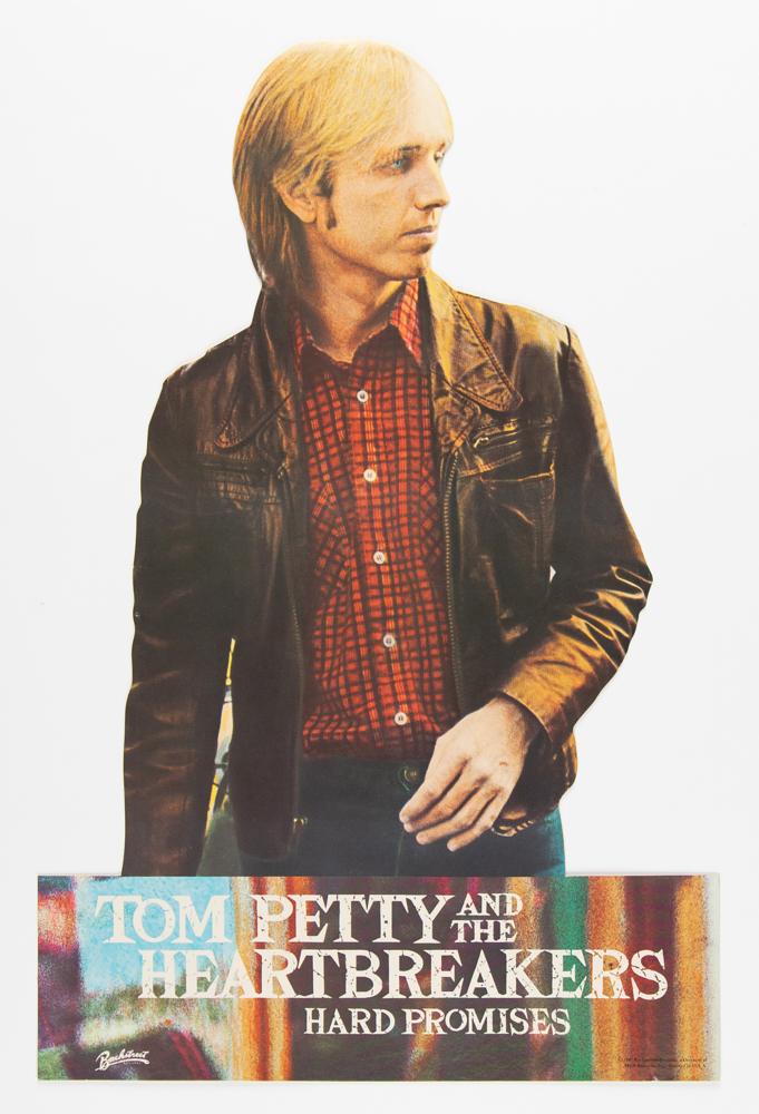 Scarce original Backstreet Records promotional cardstock display for Hard Promises, the fourth studio album by Tom Petty and the Heartbreakers, which was released on May 5, 1981. The display measures 12 x 18.25 and features Petty as he’s pictured on the front cover, wearing a plaid shirt and leather jacket in a three-quarter-length pose. In very fine condition.