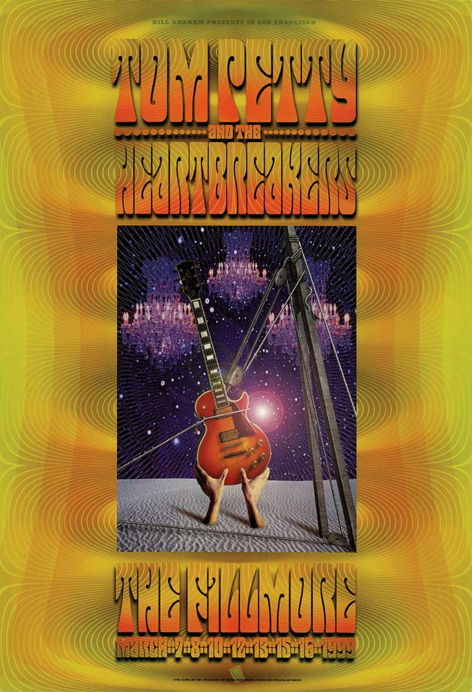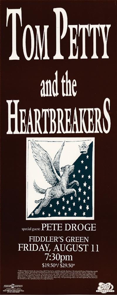 Two original concert posters for Tom Petty and the Heartbreakers: a 7 x 17.5 poster for a concert at Fiddler's Green Amphitheatre in Greenwood Village, Colorado, on August 11, 1995, as part of the Dogs with Wings Tour, listing Pete Droge as the special guest; and a psychedelic 13 x 19 poster for the band’s multi-night residency at The Fillmore in San Francisco, California, between March 7 and 16, 1999, as part of their Echo Tour. In overall fine condition.