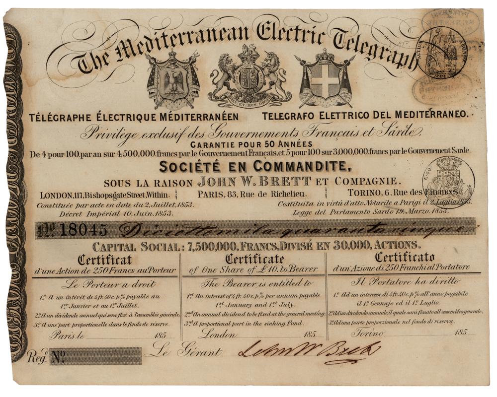 English telegraph engineer and founder of submarine telegraphy (1805-1863) who, in 1850, founded the English and Irish Magnetic Telegraph Company, which laid the first submarine telegraph cable to Ireland. He was involved in the transatlantic telegraph cable project and was confident that England and America would be linked, but he did not live to see it accomplished. Scarce DS, signed “John W. Brett,” one page, 10.25 x 8, circa 1853. Three-language stock certificate for the Mediterranean Electric Company issued for “One Share of £10. to Bearer.” Signed boldly at the conclusion by John Watkins Brett as manager. In fine condition.