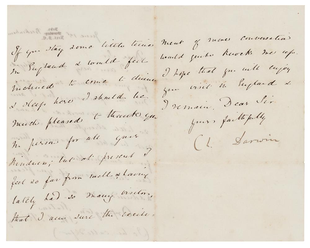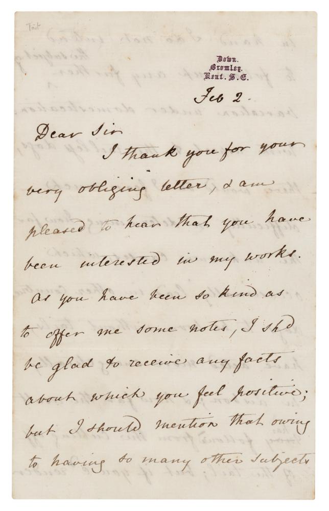Collection of four letters signed by Charles Darwin, including one ALS and three LSs (the body written by his wife Emma), totaling thirteen pages, February 2, February 24, April 18, and June 1, 1869, all to amateur botanist William Chester Tait. This fascinating series of letters reflects Charles Darwin’s wide-ranging scientific research, his indefatigable curiosity, and his encouragement of a young naturalist. In overall fine condition.