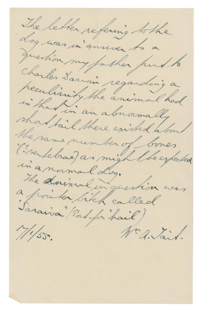In January 1869 Darwin received a letter from William Chester Tait, a British amateur botanist living in Portugal. Tait wrote glowingly to Darwin about his books, especially On the Origin of Species (1859) and his recently published Variation of Animals and Plants Under Domestication (1868). The young Tait then shared his observations on tailless dogs in Portugal. He observed that the tails of pointers are often docked and wonders if this might account for the occasional birth of tailless dogs, relating to the theory of pangenesis advanced in Darwin’s latest book.