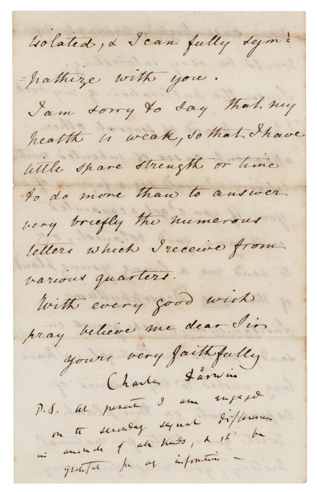 Darwin concludes his letter with the poignant observation, “With your taste for natural history, you must feel very isolated, and I can fully sympathize with you.” After the voyage of the Beagle, Darwin spent most of his scientific life at home, gathering data from personal observation there and through his vast network of correspondents.