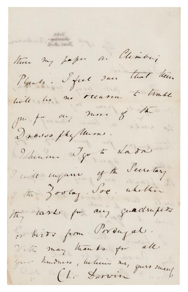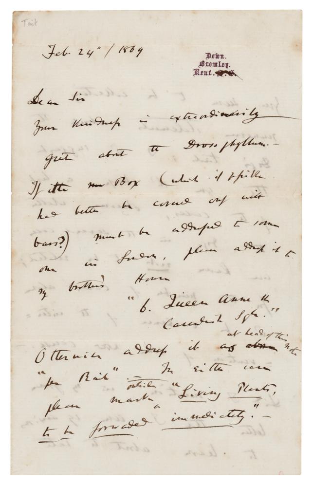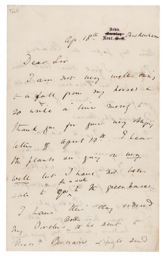 In the next letter in the collection, dated April 18, Darwin notes that he is not well due to a fall from his horse. He tells Tait that the “the plants are going on very well but I have not been to go for a week to the greenhouse.” He then notes that he has had hisbook on orchids and his paper on climbing plants sent to Tait.