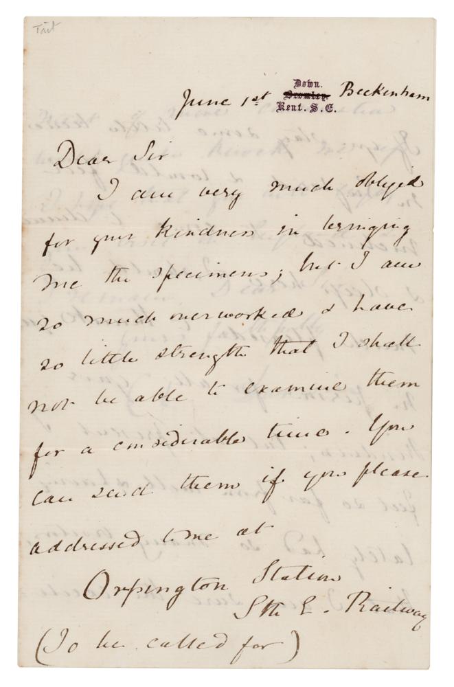 In the final letter Darwin thanks Tait for new specimens and extends an invitation for Tait to visit: “If you stay some little time in England and would feel inclined to come to dinner & sleep here I should be much pleased to thank you in person for all your kindness; but at present I feel so far from well & having lately had so many visitors, that I am sure the excitement of more conversation would quite knock me up.”