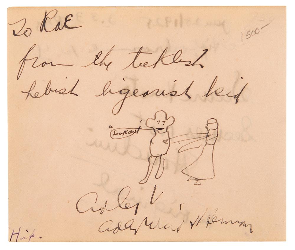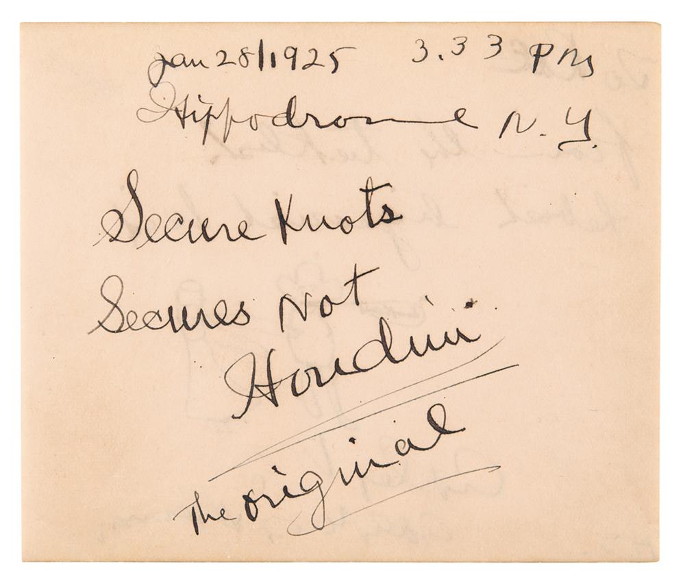 Interesting and bold AQS on a beige 5 x 4.25 album page, in full: "Jan 28/1925, 3.33 PM, Hippodrome, N.Y., Secure Knots, Secures Not Houdini, The Original." In fine condition, with light show-through from an unidentified signature on the reverse. Famed for his skill as an escape artist, this is a fantastic example of Houdini's autograph. That he signed it at the Hippodrome is also significant, as this was the venue where he debuted his 'vanishing elephant' trick in 1918.