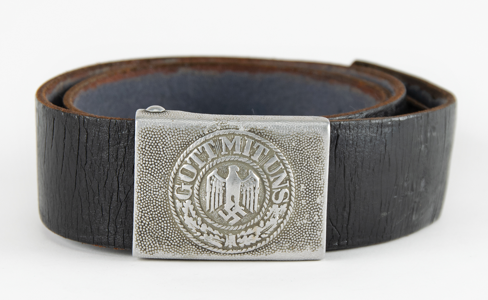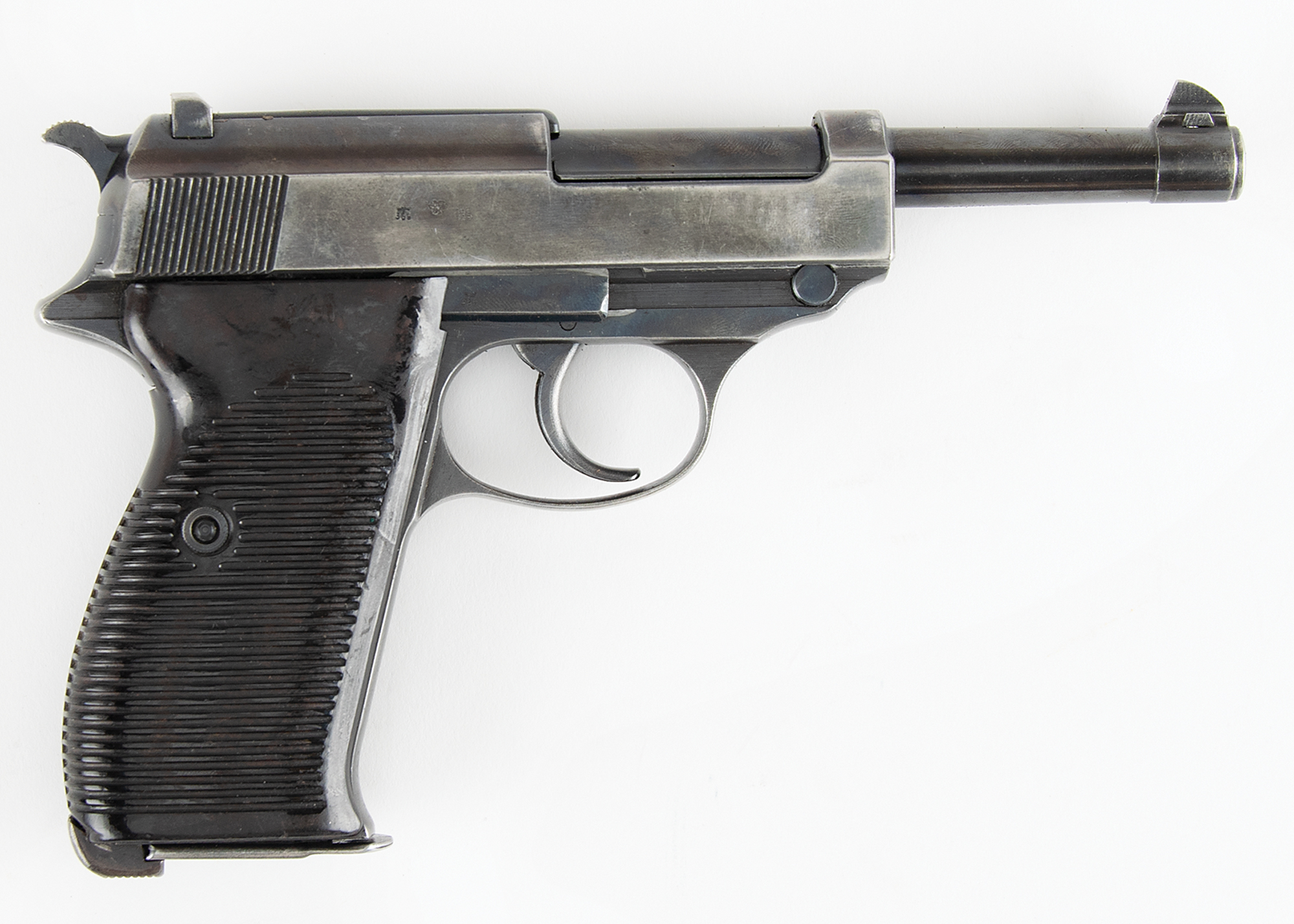 World War II-era German Walther P.38 pistol, serial #6661d, 9mm Para., 5" barrel with a fine, bright bore that has some mild freckling within the grooves towards the muzzle. This is an "ac/41" coded pistol that has matching numbers on the frame, slide, barrel, and locking block. The metal retains 90-9% of the original blue finish with some silvering at the muzzle, as well as along the raised edges and projections; and almost all of the original red and white paint remains in the "F" and "S" within the safety/decocker cut. Most of the fading occurs along the frontstrap and along the sides of the slide. The dark brown phenolic resin grips are in excellent condition and exhibit little wear and few handling marks. The pistol is housed in an "ewx / 1942" (Franz u. Karl Vogels, Lederwarenfabrik, Cologne) hard-sided P.38 black leather holster which is in fine condition showing only minor surface scuffs and some moderate crazing, mostly on the closure tab and belt loops. Additionally, two Waffenamt proofed magazines are also included; one is original with matching numbers, while the other is a later, unnumbered example with "(eagle) / 135" Waffenamt proof. Also included is a German Army (Heer) officer’s felt-backed dress belt (size 96) that has a mostly bright "GOTT MIT UNS" buckle, and is in fine shape with some minor crazing along the exterior leather, and some very minor insect damage to the gray felt backing fabric. This is a fine example of an early war P.38, complete with some original accessories. Transferrable under FFL or C&R.
