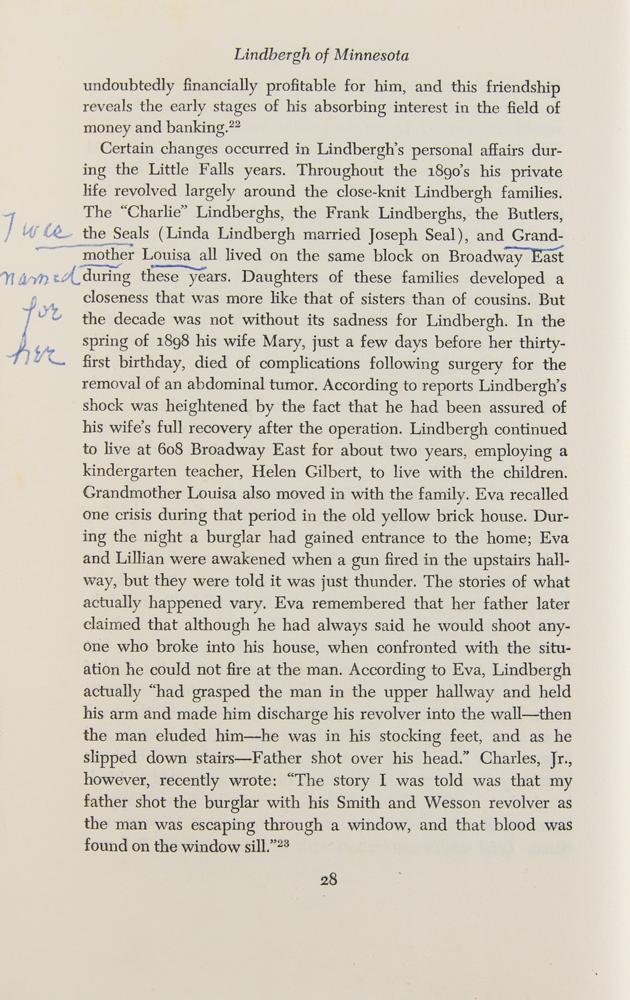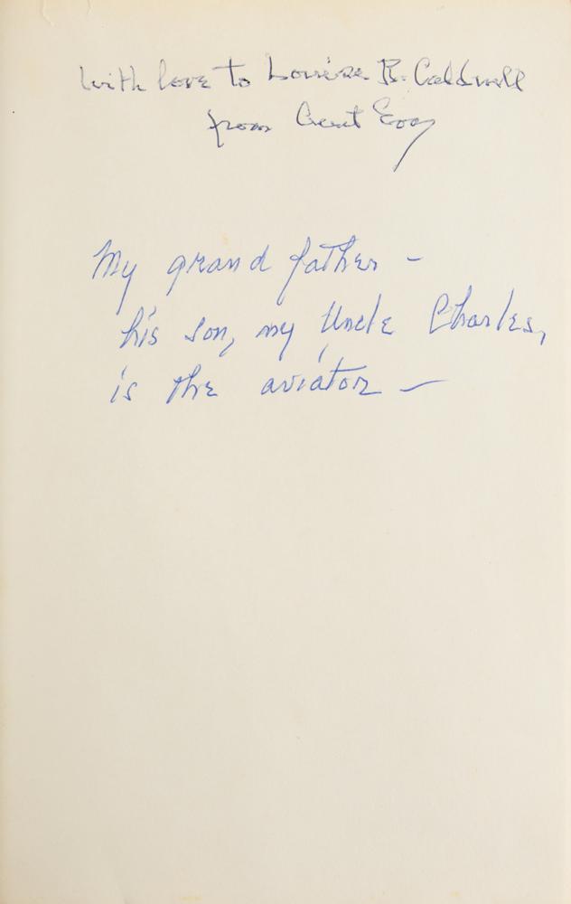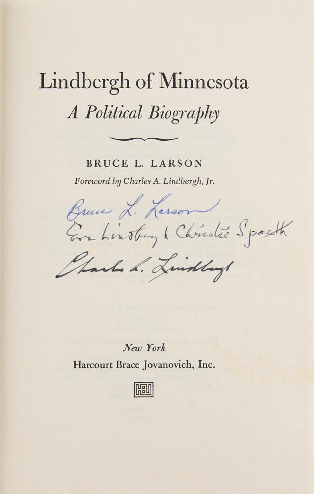 Signed book: Lindbergh of Minnesota: A Political Biography. First edition. NY: Harcourt Brace Jovanovich, 1973. Hardcover with dust jacket, 5.75 x 8.5, 363 pages. Signed on the title page by the famed aviator in black ink, "Charles A. Lindbergh," and in blue ballpoint by the author, "Bruce L. Larson." Additionally signed by his half-sister, Eva Lindbergh Christie Spaeth, with an additional presentation inscription by her on the first free end page, "With love to Louise R. Caldwell," the aviator's niece. On page 28, Louise adds a notation to the margin stating that she was named for "Grandmother Louisa." In very good to fine condition, with light wear and a few small tears to the dust jacket, and slight foxing to signed page and textblock edges. A fascinating piece of Lindbergh family history, highlighted by the sought-after signature of the celebrated aviator.