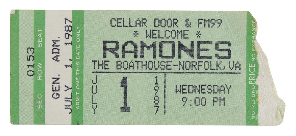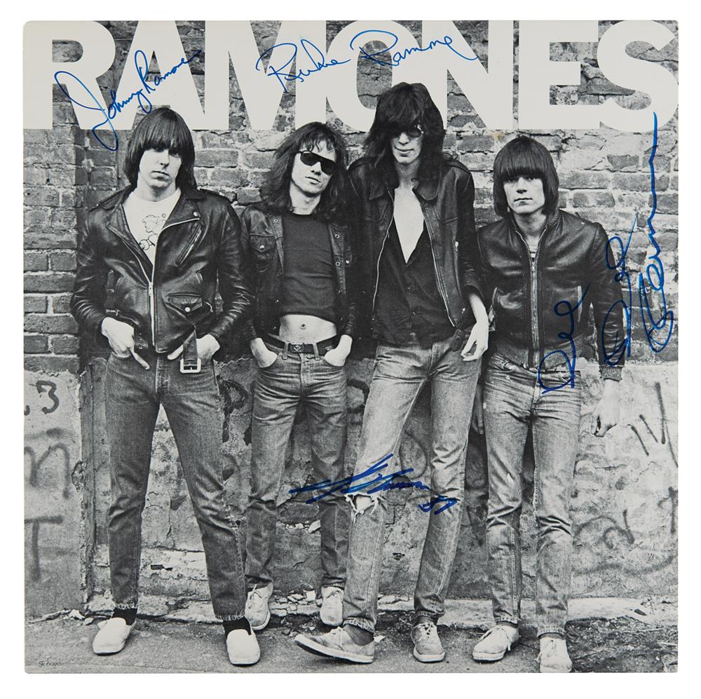 Self-titled debut album signed on the front cover in blue felt tip by Johnny, Joey, Dee Dee, and Richie Ramone. In fine condition. The record is included. Accompanied by a ticket stub for their show at The Boathouse in Norfolk, Virginia, on July 1, 1987.