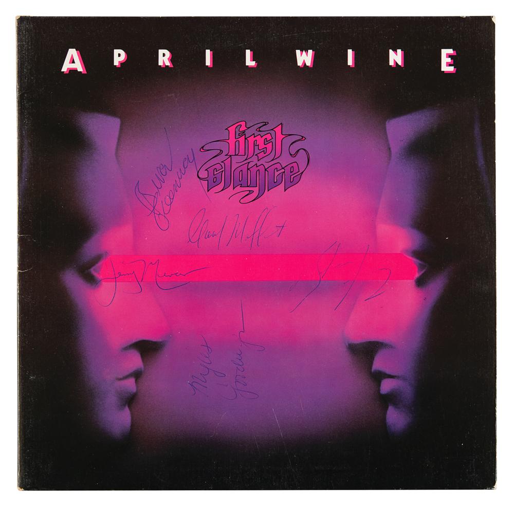 First Glance album signed on the front cover in blue ballpoint by Myles Goodwyn, Gary Moffet, Steve Lang, Brian Greenway, and Jerry Mercer. In fine condition. The record is included. A great vintage-signed album by the classic April Wine lineup.