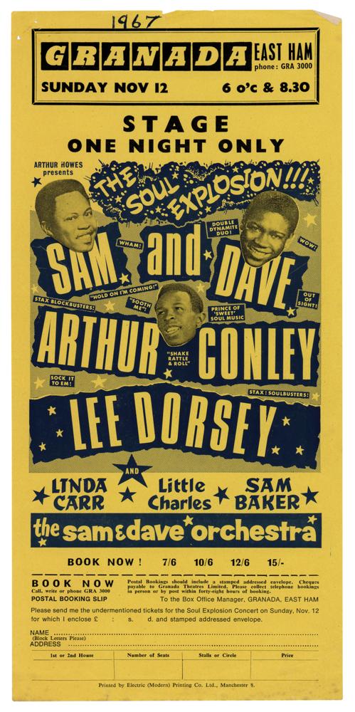 Vintage blue-and-yellow 5.75 x 12 handbill for “The Soul Explosion,” a concert headlined by Sam and Dave, Arthur Conley, and Lee Dorsey at the Granada Cinema in East Ham, London, on November 12, 1967. Presented by Arthur Howes, the show also featured Linda Carr, Little Charles, and Sam Baker. The lower portion bears the postal booking form. In fine condition, with light edge wear. Accompanied by a certificate of authenticity from Tracks.