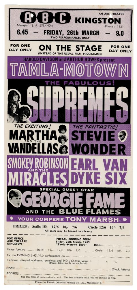 Vintage color 5.25 x 11.25 handbill for a “Tamla-Motown” concert showcase featuring The Supremes and Stevie Wonder at the ABC Theatre in Kingston, London, on March 26, 1965. Presented by Harold Davison and Arthur Howes, the show also featured Martha and the Vandellas, Smokey Robinson and the Miracles, the Earl Van Dyke Six, and Georgie Fame. The lower portion bears the postal booking form. In fine condition, with small holes to the top. Accompanied by a certificate of authenticity from Tracks.