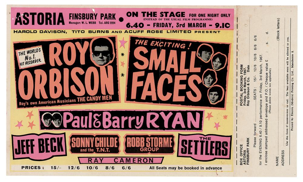 Vibrantly colored vintage 9.75 x 5.75 handbill for a concert featuring Roy Orbison, Small Faces, and Jeff Beck at the Astoria Theatre in Finsbury Park, London, on March 3, 1967. The show also featured Sonny Childe and the T.N.T., Robb Storme Group, The Settlers, and Ray Cameron. The right portion bears the postal booking form. In fine condition, with small holes to the top. Accompanied by a certificate of authenticity from Tracks.