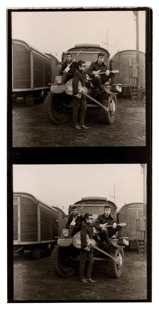 Original vintage glossy 2.5 x 5 clipped section of a contact sheet containing two images of the Beatles taken by photographer Astrid Kirchherr in November 1960 at Heiligengeistfeld Square in Hamburg, Germany, as part of the Beatles’ first photo session. Both images depict Beatles members George Harrison, Stuart Sutcliffe, and John Lennon posing together on a truck. Reverse bears Agfa watermarks. In fine condition. Accompanied by a certificate of authenticity from Tracks.