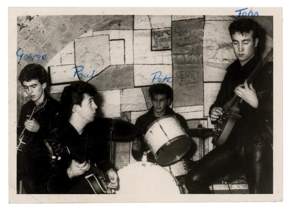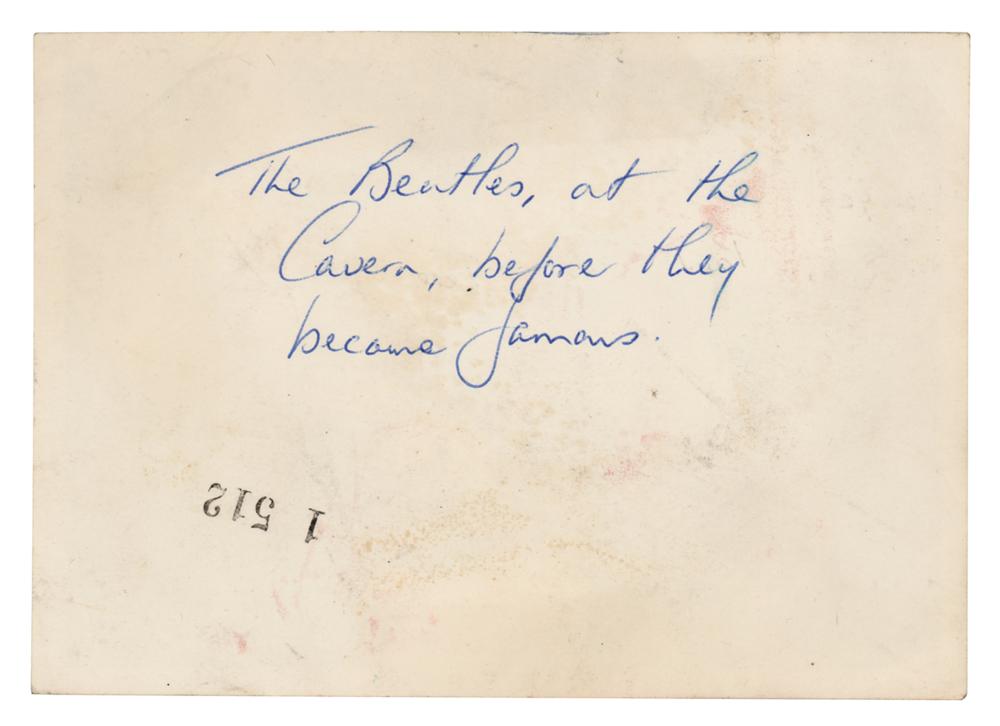 Original vintage glossy 5 x 3.5 photo of the Beatles, consisting of John Lennon, Paul McCartney, George Harrison, and Pete Best, performing at the Cavern Club in Liverpool in mid-1961. An unknown hand has added the first names of each musician above their respective image, and the reverse is annotated: “The Beatles, at the Cavern, before they became famous.” The consignor notes that the photograph is thought to have been taken by Bob Dean. In very good to fine condition, with scattered light creasing. Accompanied by a certificate of authenticity from Tracks.