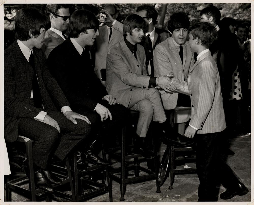 Vintage glossy 10 x 8 photo of the Beatles seated on stools and shaking hands with a young boy, an image taken at a ‘Meet the Beatles’ charity garden party in Brentwood, California, on August 24, 1964. The event, which took place one day after the group’s concert at Hollywood Bowl in Los Angeles, was organized by the head of Capitol Records, Alan W. Livingston. The gathering was initially to be held at his personal home, but due to security concerns, he moved it to the residence of his mother-in-law. A host of celebrity guests and their families attended and, following the meet-and-greet, each member of the Beatles was presented with a plaque thanking them for their cooperation. The reverse bears a Capitol Records stamp. In very good to fine condition, with scattered light creasing. Accompanied by a certificate of authenticity from Tracks.