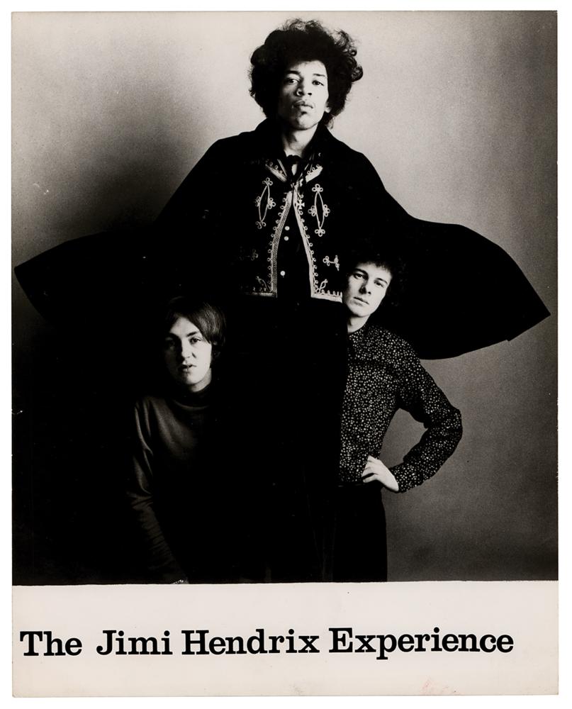 Vintage glossy 8 x 10 promotional photo of the Jimi Hendrix Experience that dates to 1967 and features an image of the band taken by photographer Bruce Fleming in his London studio in early 1967. In fine condition, with slight edgewear, including a small left edge tear. Accompanied by a certificate of authenticity from Tracks.