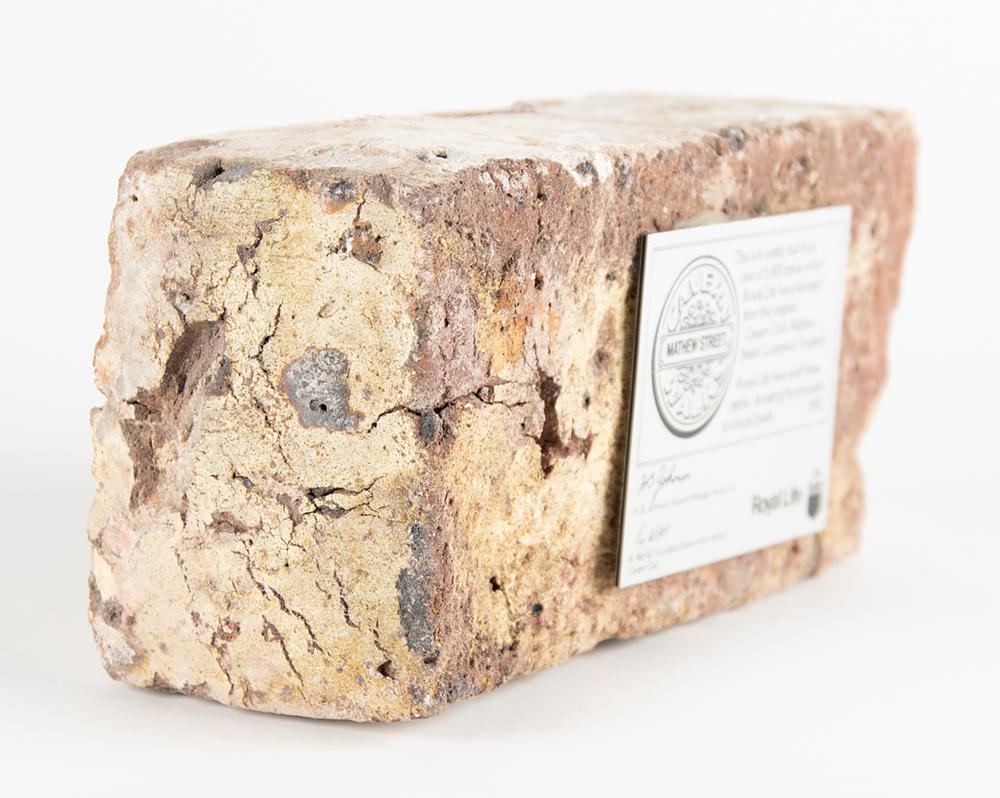 Brick from the original Cavern Club on Mathew Street, Liverpool, measuring 8.75″ x 4.5″ x 3″, bearing an affixed plaque from Royal Life: "This is to certify that this is one of 5000 bricks which Royal Life have salvaged from the original Cavern Club, Mathew Street, Liverpool, England. Royal Life have sold these bricks, donating the proceeds to a local charity." The plaque also has the Cavern Walks logo, and printed signatures from H. B. Johnson (general manager of Royal Life) and Ray McFall (founding owner of the original Cavern Club). In very good to fine condition. Accompanied by a certificate of authenticity from Tracks.