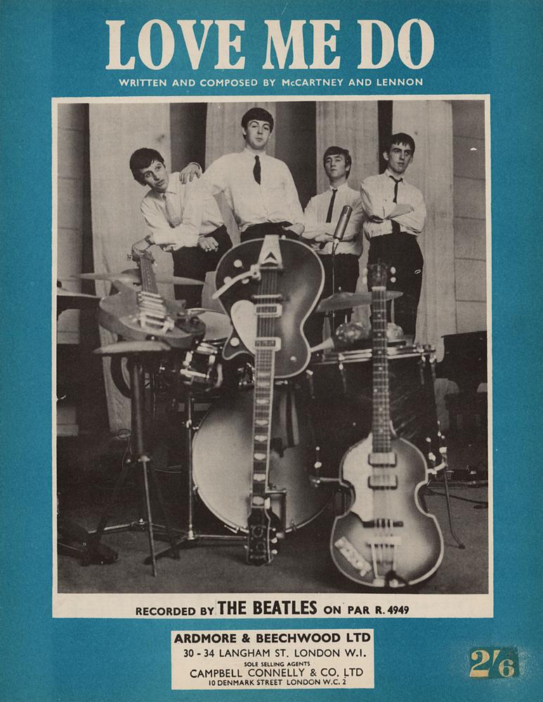 Vintage sheet music booklet for the Beatles’ 1962 debut single ‘Love Me Do,’ two pages, 8.5 x 11, published by Ardmore and Beechwood Ltd. The cover image of the Beatles was taken by Dezo Hoffmann at EMI’s, Abbey Road, London Studios on September 4, 1962, during the recording session for the single, which was released on Parlophone Records on October 5, 1962, with the catalog number 45-R 4949. In fine condition. Accompanied by a certificate of authenticity from Tracks.