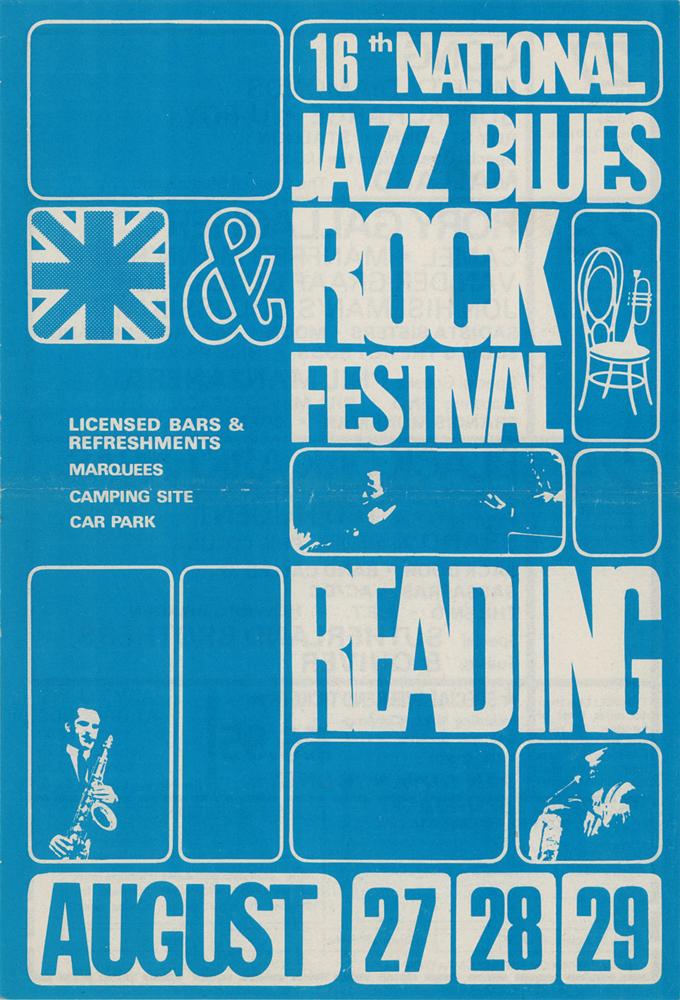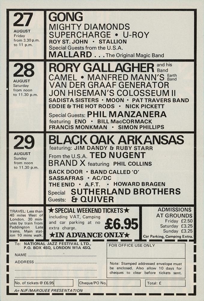 Original vintage 5.75 x 8.25 dual-sided handbill for the 16th National Jazz Blues Rock Festival, which took place in Reading, Berkshire, England, between August 27-29, 1976, with the reverse listing the scheduled acts for each day. The final day, Sunday, August 29th, featured AC/DC, Ted Nugent, and Brand X (with Phil Collins), the Saturday show included Rory Gallagher, Camel, Manfred Mann’s Earth Band, Phil Manzanera, and Eddie and the Hot Rods, and the Friday show was headlined by Gong. In fine condition, with a central horizontal fold. Accompanied by a certificate of authenticity from Tracks.