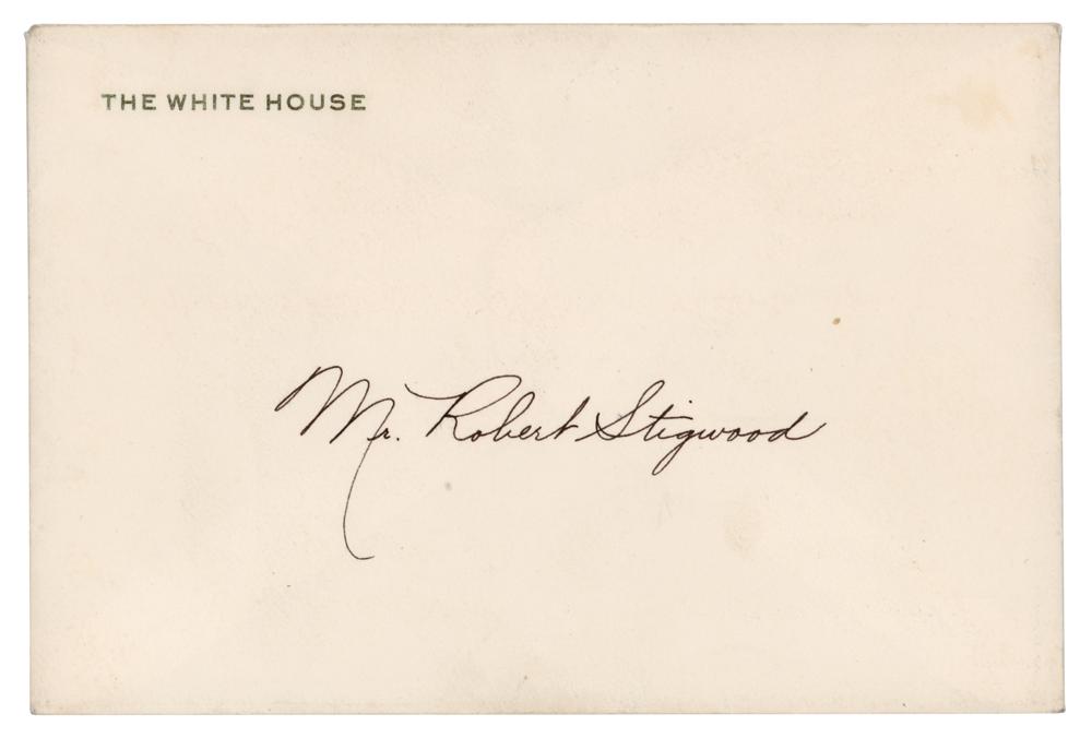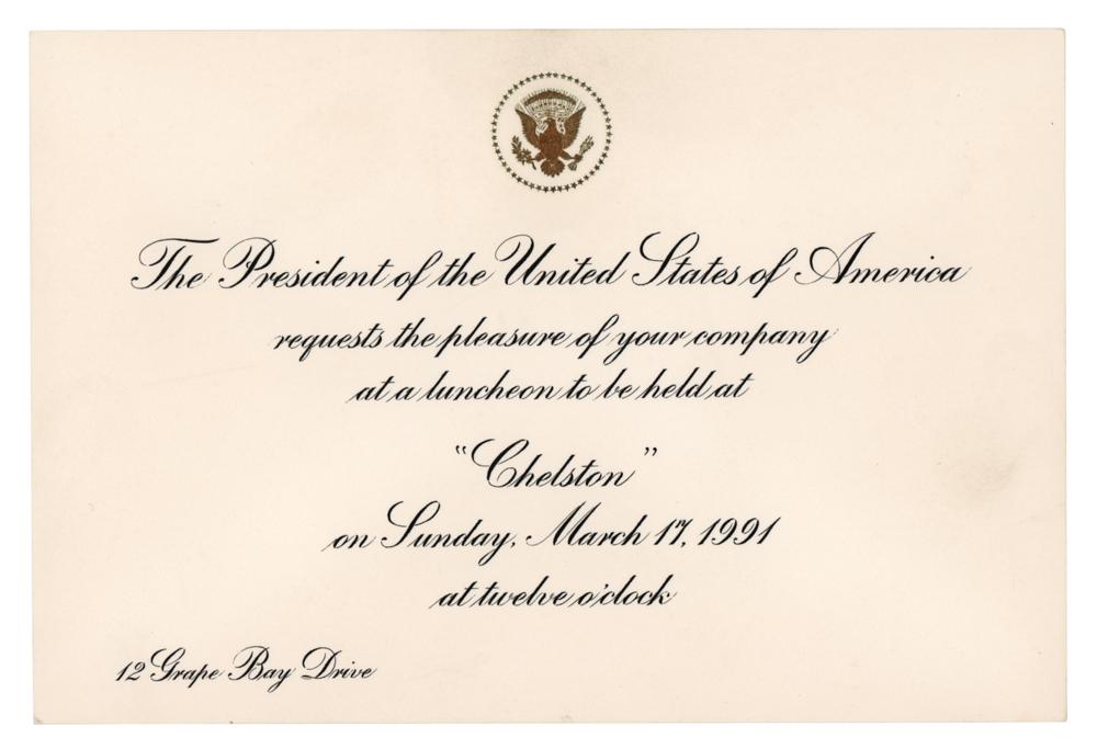 An official invitation card from President George Bush to impresario and music producer Robert Stigwood, 6.25 x 4.25, requesting his company “at a luncheon to be held at ‘Chelston’ on Sunday, March 17, 1991, at twelve o’clock.” Includes the original White House mailing envelope addressed to “Mr. Robert Stigwood.” In very fine condition. Accompanied by a certificate of authenticity from Tracks.