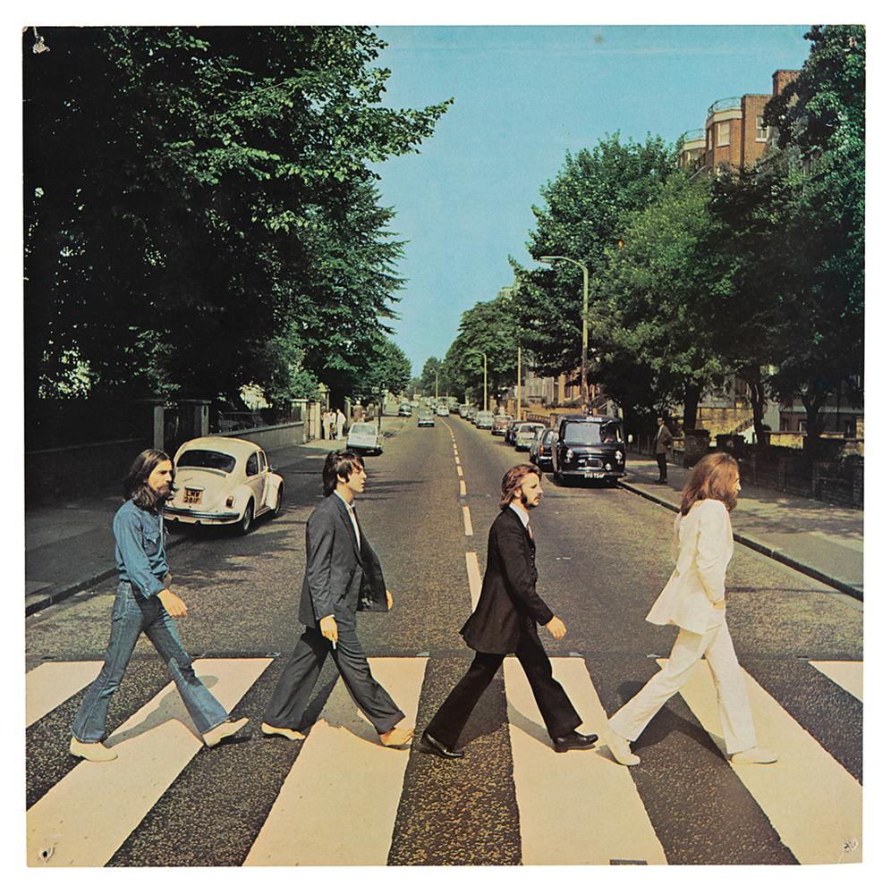 Set of five color satin-finish 'Abbey Road' photographs taken by Iain Macmillan, all approximately 12 x 12 and mounted on foamcore, featuring three 'outtakes' from the session as well as the images used for the front and back covers of the Beatles' Abbey Road album. Macmillan had just ten minutes to capture the perfect shot for the iconic record cover. All bear Ron Jones address labels on the reverse. In fine condition, with tack holes to the corners.