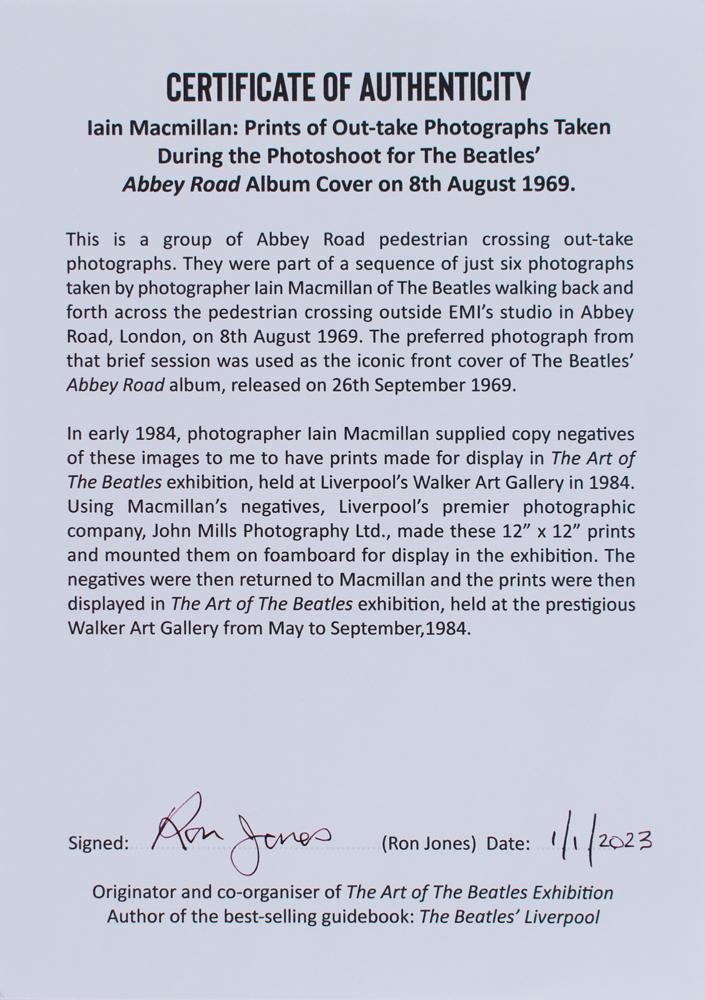 Accompanied by a certificate of authenticity from Tracks and a certificate of authenticity from Ron Jones, originator and co-organizer of 1984's The Art of The Beatles exhibition and author of The Beatles' Liverpool. Jones writes, in part: "In early 1984, Ian Macmillan supplied copy negatives of these images to me to have prints made for display in The Art of The Beatles exhibition, held at Liverpool's Walker Art Gallery in 1984. Using Macmillan's negatives, Liverpool's premier photographic company, John Mills Photography Ltd., made these 12″ x 12″ prints and mounted them on foamboard for the exhibition."