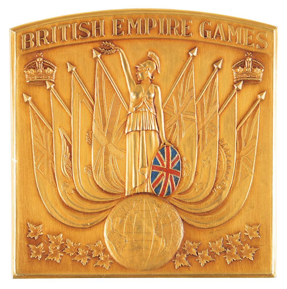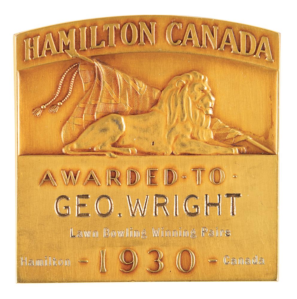 Attractive winner's medal issued for the 1930 British Empire Games—the inaugural edition of what now is known as the Commonwealth Games—held in Hamilton, Ontario, Canada, from August 16-22, 1930. Gold filled, 53 mm x 54 mm, 81 gm. The front shows the allegorical Britannia holding an enameled Union Jack shield, standing on a globe with the flags of competing nations, with "British Empire Games" overhead; the reverse features a lion and is inscribed with the name of the winner: "Awarded to Geo. Wright, Lawn Bowling Winning Pairs, Hamilton, Canada, 1930." Stamped "Gold Filled" on the edge.