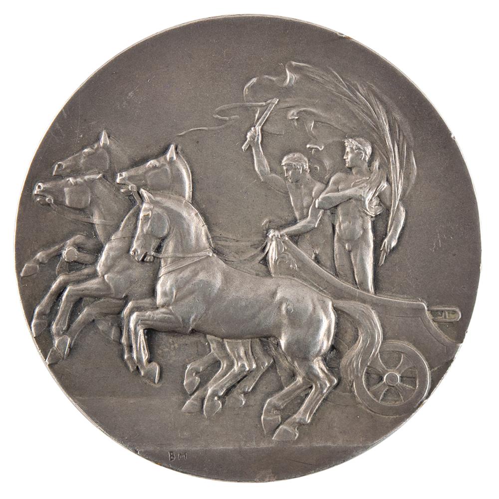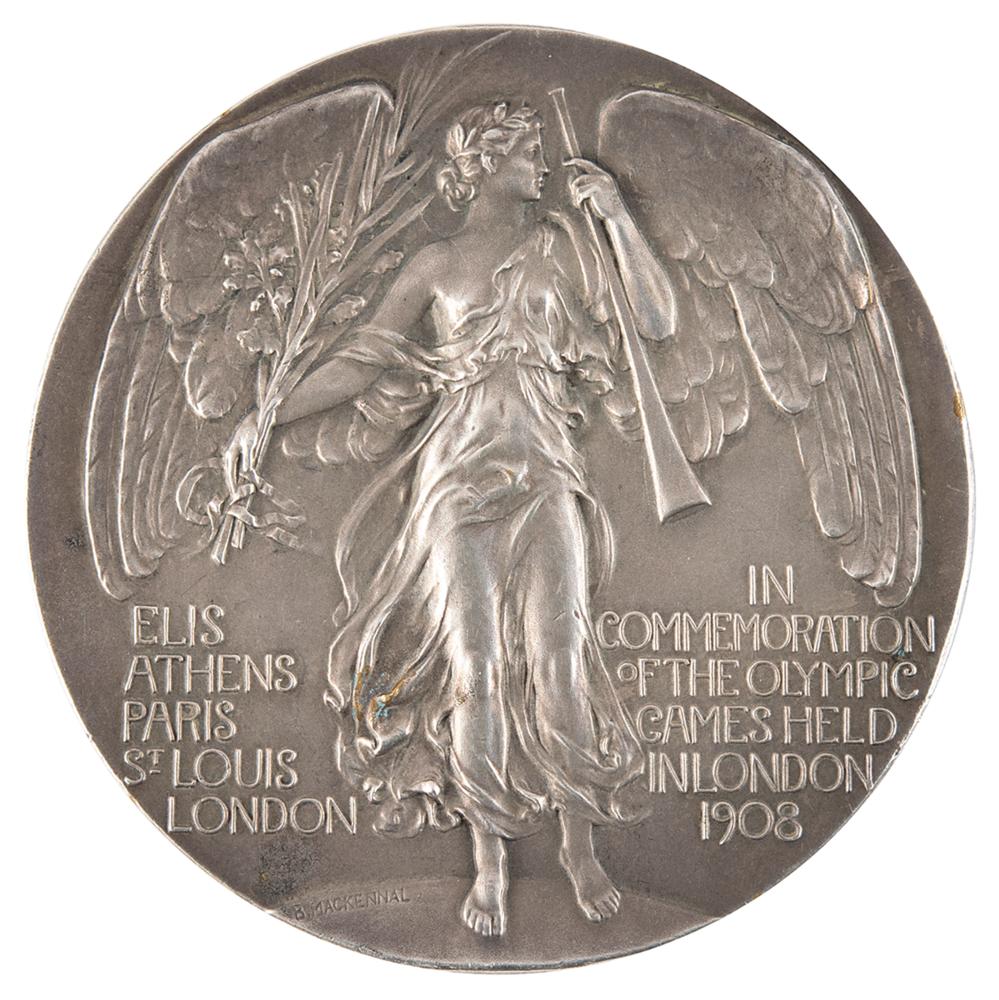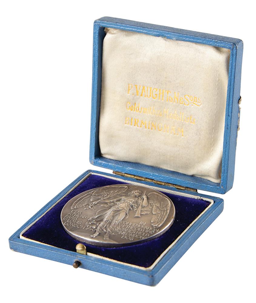 Steward's participation medal issued for the London 1908 Olympics. Silvered bronze, 51 mm, 60 gm, by Bertram Mackennal. The front depicts a quadriga with charioteer and judge, preparing to present the palm of victory; the reverse bears the winged figure of Fame standing on a globe with raised text on either side, "Elis, Athens, Paris, St. Louis, London" and "In Commemoration of the Olympic Games Held in London, 1908." Stamped on the edge by the maker, "Vaughton." Includes its original blue P. Vaughton & Sons hinged case, stamped on the lid: "Olympic Games, Steward, London. 1908."