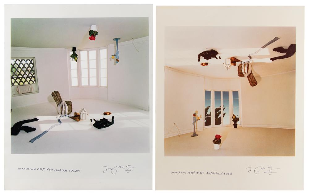 Three extraordinary pieces of original album cover working artwork developed for Fleetwood Mac's highly acclaimed album Tusk, including an alternate version of the 'floating collage' inner sleeve image, which author Ryan Reid notes in his book Fleetwood Mac FAQ 'remains Tusk's true visual centerpiece.' The three color chromogenic prints range in size from 16 x 20 to 23.5 x 20, and are all signed in the lower border in black felt tip, "Working Art for Album Cover, Jayme Odgers." The alternate 'floating collage' print measures 23.5 x 20, and the two variants of the 'indoor collage' are 16 x 20; one is interesting in that the panes in the window have been carefully excised, leaving a grid of rectangular holes in the center of the print. Includes examples of both Tusk inner sleeves that feature the final versions of this artwork. In fine condition.