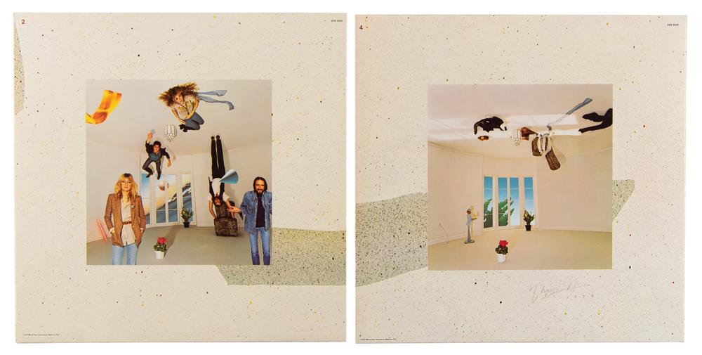Eventually he conceptualized the album’s vivid “upside-down” shot featured in the inner booklet [in the vinyl version, the inner sleeves,] a collage that shows the band drifting around a surreal living room scene where ceiling and floor are blurred into one. Christine and John McVie are planted on the ground; Fleetwood clings to a chair above his head; Stevie Nicks and Lindsey Buckingham float around in an eye-popping display of antigravity camera trickery.