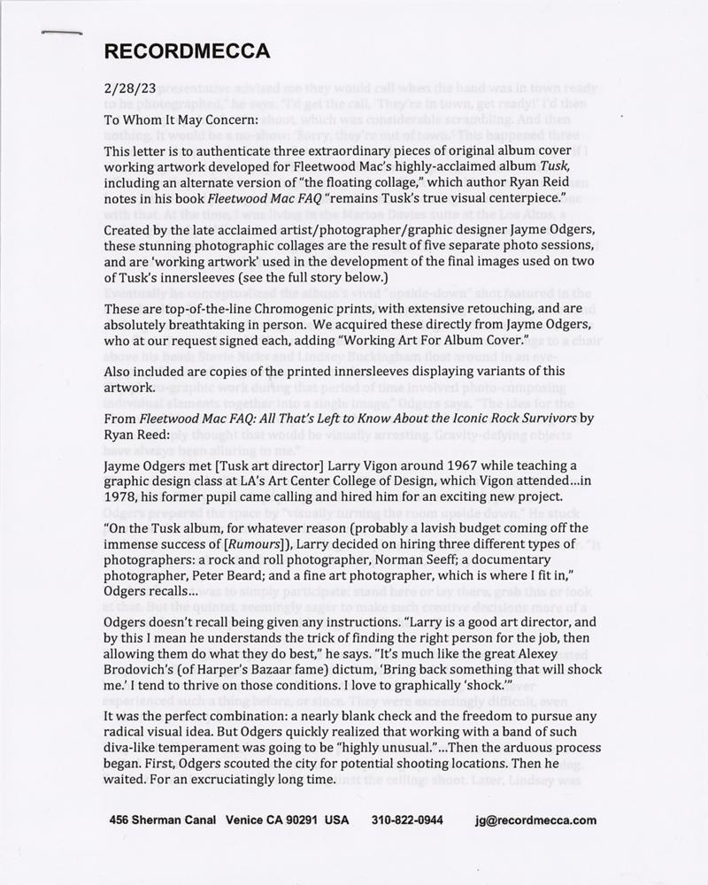 Accompanied by a detailed letter of authenticity from Recordmecca's Jeff Gold, in small part: "Created by the late acclaimed artist/photographer/graphic designer Jayme Odgers, these stunning photographic collages are the result of five separate photo sessions, and are 'working artwork' used in the development of the final images used on two of Tusk's innersleeves. These are top-of-the-line Chromogenic prints, with extensive retouching, and are absolutely breathtaking in person. We acquired these directly from Jayme Odgers."