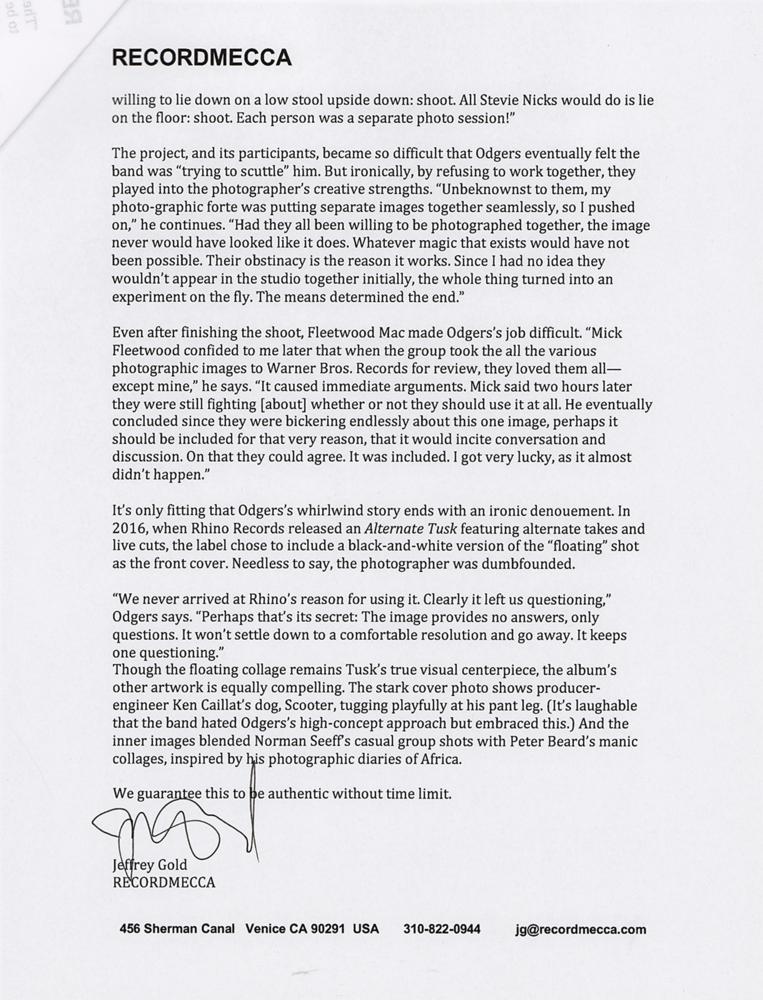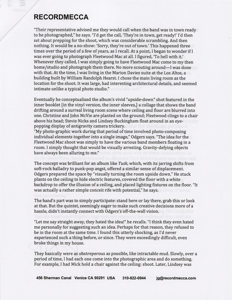 “On the Tusk album, for whatever reason (probably a lavish budget coming off the immense success of [Rumours]), Larry decided on hiring three different types of photographers: a rock and roll photographer, Norman Seeff; a documentary photographer, Peter Beard; and a fine art photographer, which is where I fit in,” Odgers recalls?