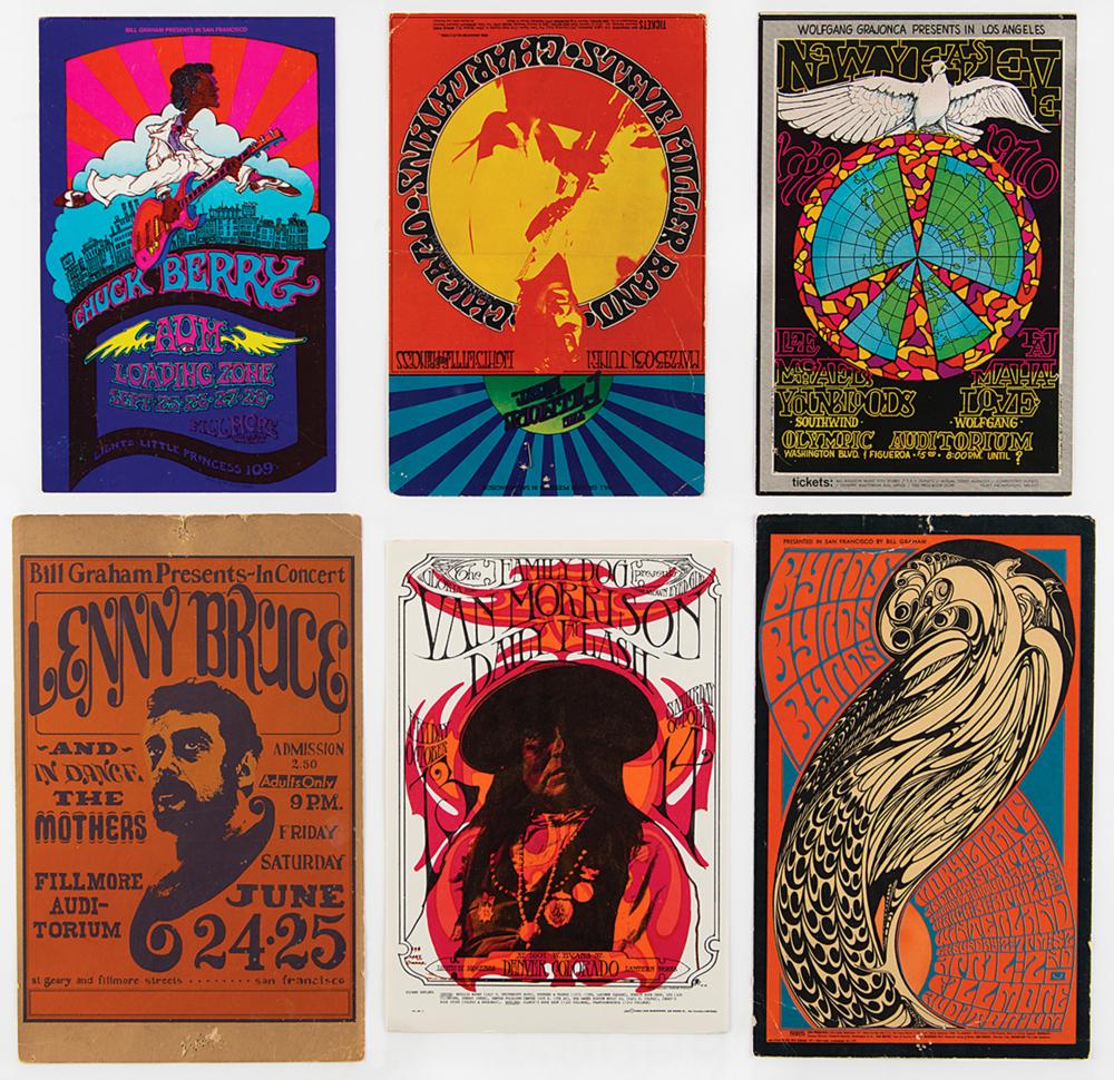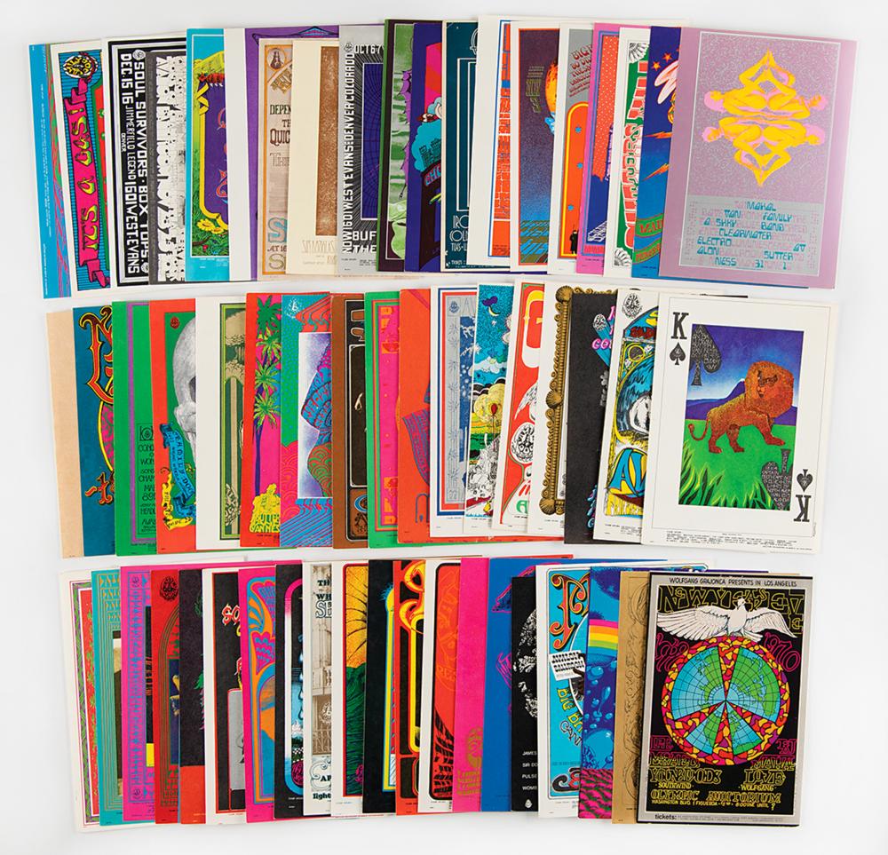 Fantastic collection of 65 original handbills and postcards featuring psychedelic artwork, mostly for Family Dog Productions in San Francisco during the late 1960s. Among the various bands and solo acts represented in the group are the Grateful Dead, Big Brother & the Holding Company (Janis Joplin), the Byrds, Velvet Underground, Canned Heat, Creedence Clearwater Revival, Buffalo Springfield, Van Morrison, Moby Grape, Chuck Berry, Taj Mahal, Bo Diddley, Buddy Guy, James Cotton, Bukka White, Blue Cheer, Captain Beefheart, the Charlatans, Lenny Bruce, Quicksilver Messenger Service, Miller Blues Band, Vanilla Fudge, Country Joe and the Fish, the Youngbloods, the Electric Flag, and many more. In overall fine condition, with folds and tack holes to a few.