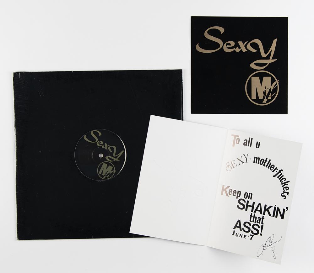 The third item is a black unused “Sexy MF” sticker measuring 7” x 7.” The vinyl is unopened, and the other items are in fine condition, carefully preserved for 30+ years by an attendee of the birthday party.
