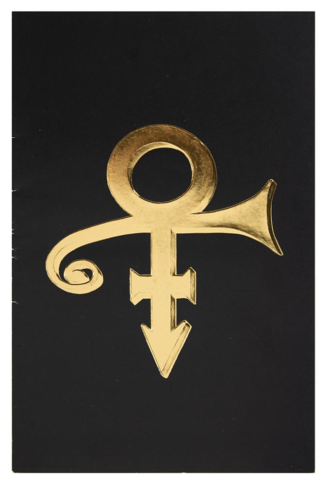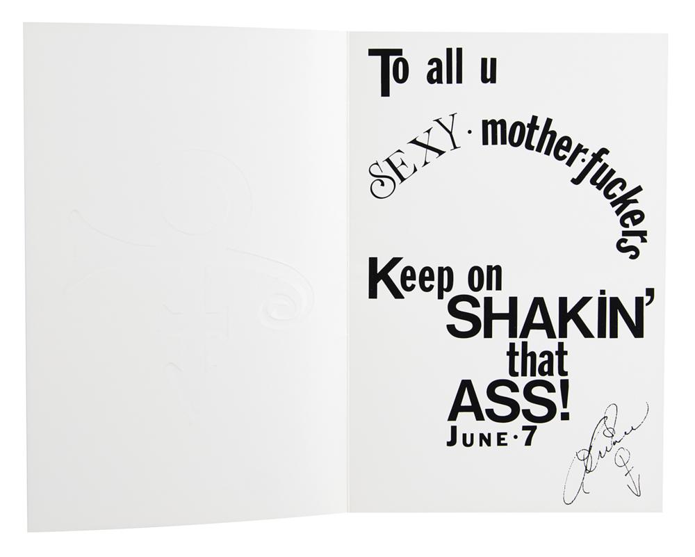 The second item is a 9” x 6” black greeting card with a pre-printed signature by Prince. The outside of the card is black with the gold “Love Symbol” (the name he used from 1993 to 2000) on it. The text on the card’s inside reads “To all U Sexy Motherfuckers, Keep on Shakin’ that Ass! June 7” in the style of Prince’s handwriting.