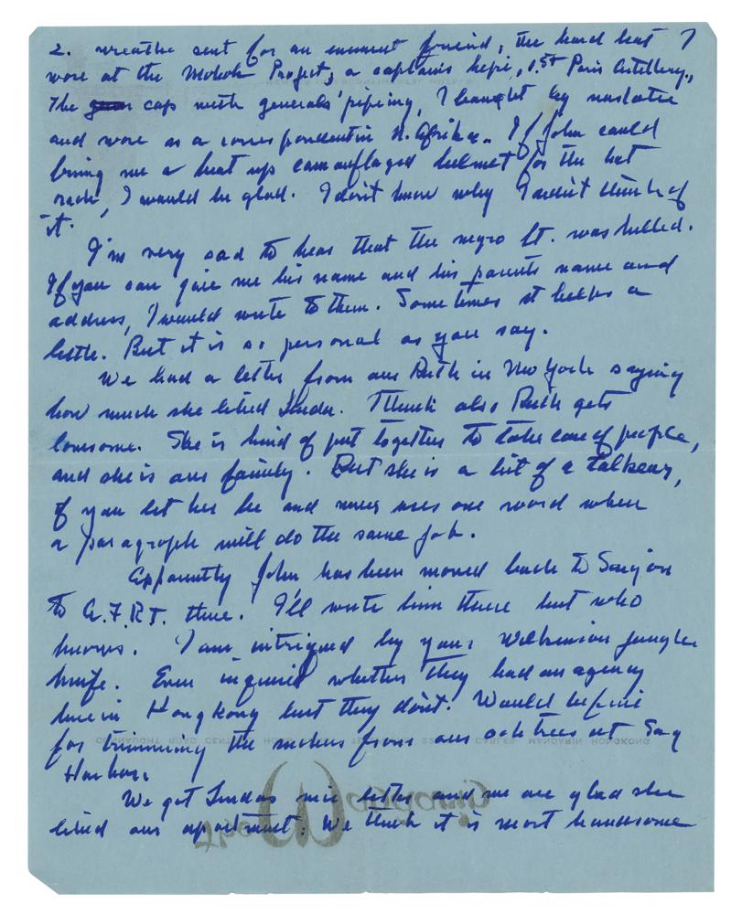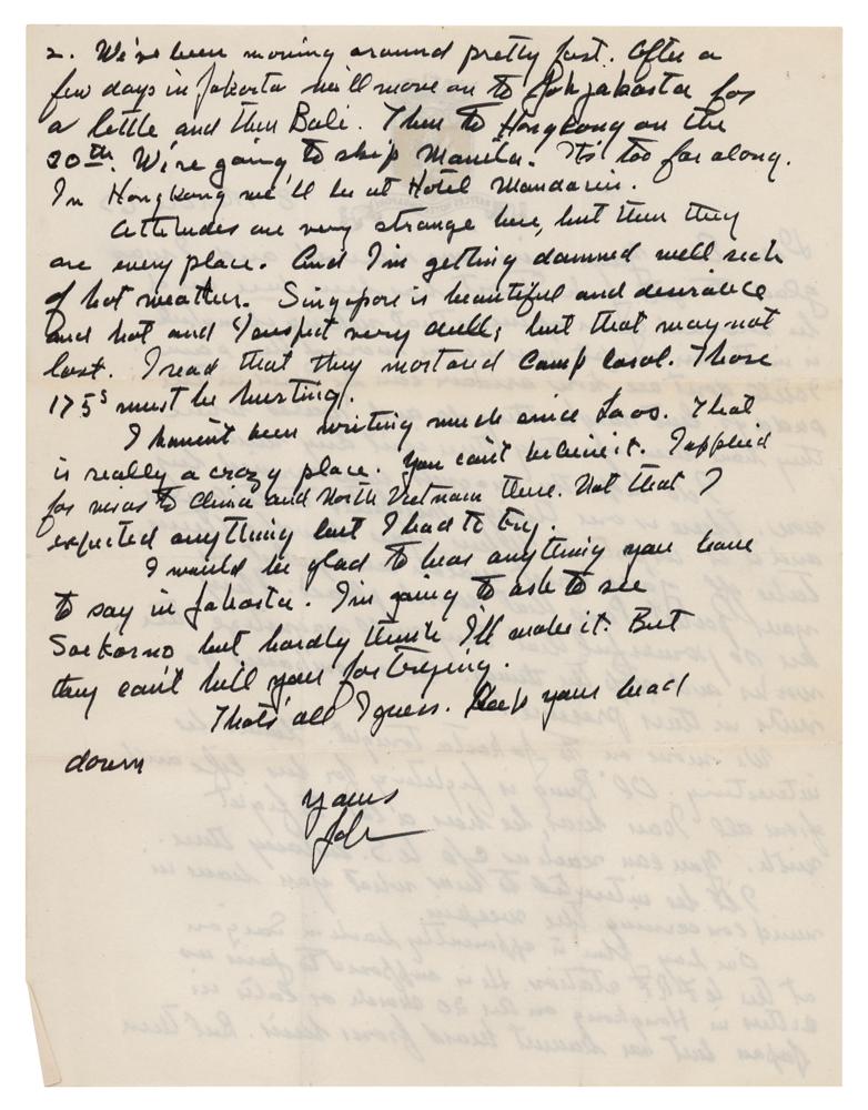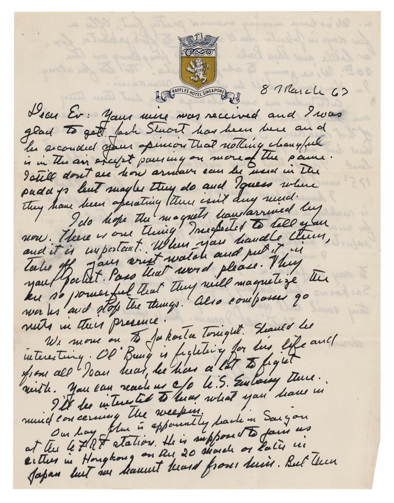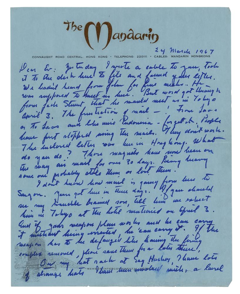 4. ALS signed "John," six pages, 7 x 8.75, The Mandarin (Hong Kong) letterhead, March 24, 1967, in part: "Yesterday I wrote a cable to you, took it to the desk here to file and found your letter. We hadn’t heard from John for five weeks. He was supposed to meet us here. But word got through from Jack Stuart that he would meet us in Tokyo April. The frustration of mail?! From Laos or to Laos and likewise Indonesia—forget it. People have just stopped using the mails. They don’t work?Those magnets have now been on the way air mail for over 30 days. Being heavy some one probably stole them or lost them. I don’t know how mail is going from here to Saigon. Yours got here in three days. If you should see my knuckle brained son, tell him we expect him in Tokyo at the hotel mentioned on April 3. And if your weapon plan works and he can carry it without being arrested, he can carry it. If the weapon has to be defanged like having the firing complex removed, please save them for a later time. On my hat rack at Sag Harbor I have lots of strange hats?the hard hat I wore at the Mohawk Project, a captain’s kepi, 1st Paris Artillery, the cap with general’s piping, I?wore as a correspondent in N. Africa. If John could bring me a beat up camouflage helmet for the hat rack, I would be glad. I don’t know why I didn’t think of it. Apparently John has been moved back to Saigon to A.7.R.T. then. I’ll write him there but who knows. I am intrigued by your Wilkinson jungle knife. Even inquired whether they had an agency here in Hong Kong but they don’t. Would be fine for trimming the suckers from our oak trees at Sag Harbor?This has been a most interesting tour. And it should be nearly over unless there is a break in Saigon. Jack Stuart asks when I am going back. But in Penang I told him I would go back only if there was a change. The change seems to be increased action. I wish you wouldn’t push your luck. You’ve had just about every limit there is. Don’t push it! I don’t know what to do about the magnets. They will get there for the next war. If they aren’t there when I get home late in April, I’ll put a couple in McNamara’s hands and tell him to send them by courier. Incidentally, I’ll be seeing the President, Rush and McNamara. Any messages.