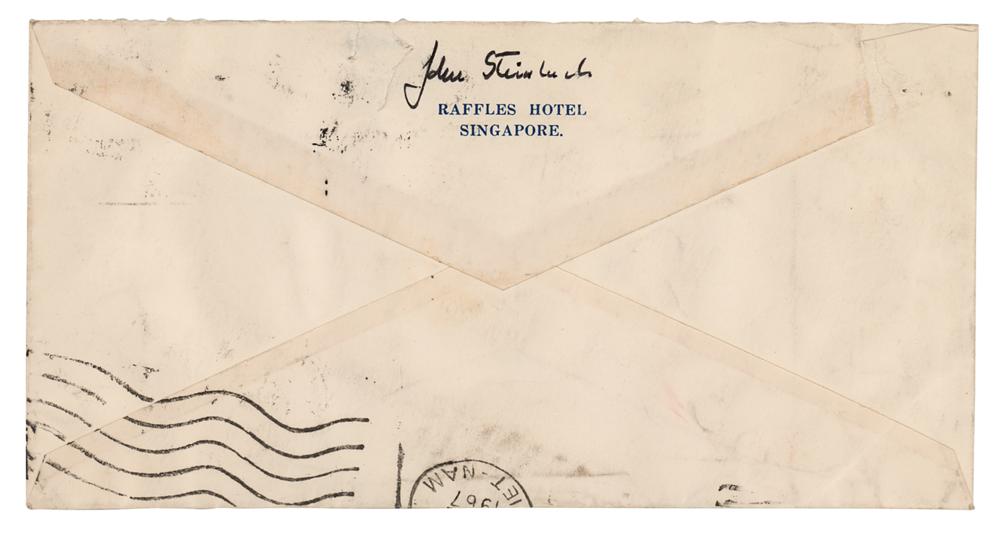 3. ALS signed "John," one page, 7.75 x 10, Raffles Hotel Singapore letterhead, March 8, 1967, in part: "Your wire was received and I was glad to get. Jack Stuart has been here and he seconded your opinion that nothing changeful is in the air except pausing on more of the same. I still don’t see how armor can be used in the paddys but maybe they do and I guess where they have been operating there isn’t any mud. I do hope the magnets have arrived by now. There is one thing I neglected to tell you and it is important. When you handle them, take off your wrist watch and put it in your pocket. Pass that word please. They are so powerful that they will magnetize the works and stop the things. Also compasses go nuts in their presence. We move on to Jakarta tonight. Should be interesting. Ol' Burg is fighting for his life and from all I can hear, he has a lot to fight with. You can reach us c/o U.S. Embassy there. I’ll be interested to hear what you have in mind concerning the sweeping. Our boy John is apparently back in Saigon at the 67RT Station. He is supposed to join us either in Hong Kong on the 20 March or later in Japan but we haven’t heard from him. But then we’ve been moving around pretty fast?I haven’t been writing much since Laos. That is really a crazy place. You can’t believe it. I applied for visas to China and North Vietnam there. Not that I expected anything but I had to try. I would be glad to hear anything you have to say in Jakarta. I’m going to ask to see Sukarno but hardly think I’ll make it. But they can’t kill you for trying." Accompanied by the original mailing envelope, addressed in Steinbeck's hand, including his full name, "John Steinbeck," written on the flap.