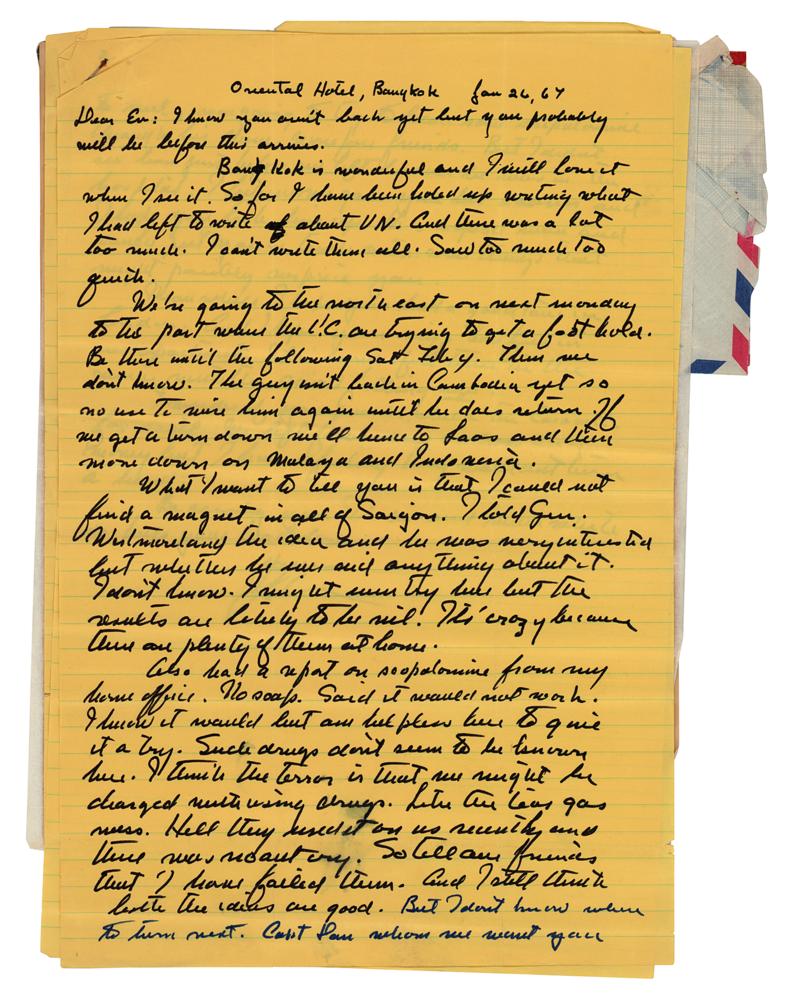 1. ALS signed "John," two pages, 8 x 12, January 26, 1967, written from the Oriental Hotel in Bangkok. In part: "Bangkok is wonderful and I will love it when I see it. So far I have been holed up writing about what I have left to write of about UN. And there was a lot, too much. I can’t write them all. Saw too much too quick. We’re going to the northeast on next Monday to this part where the VC are trying to get a fast hold. Be there until the following Sat. Feb. 4. Then we don’t know. The guy isn’t back in Cambodia yet so no use to wire him again until he does return. If we get a turn down we’ll hence to Laos and then move down on Malaya and Indonesia. What I want to tell you is that I could not find a magnet in all of Saigon. I told Gen. Westmorland the idea and he was very interested but whether he ever said anything about it, I don’t know. I might even try here but the results are likely to be nil. It’s crazy because there are plenty of them at home. Also had a report on scopolamine from my home office. No soap. Said it would not work. I know it would but am helpless here to give it a try. Such drugs don’t seem to be known here. I think the terror is that we might be charged with using drugs. Like the tear gas mess. Hell they used it on us and there was no outcry. So tell our friends that I have failed them. And I still think both the ideas are good. But I don’t know where to turn next."