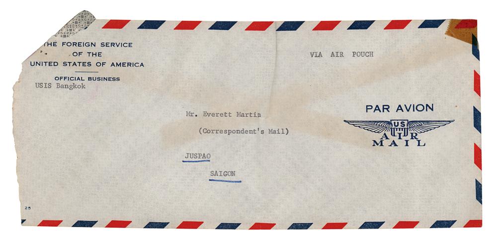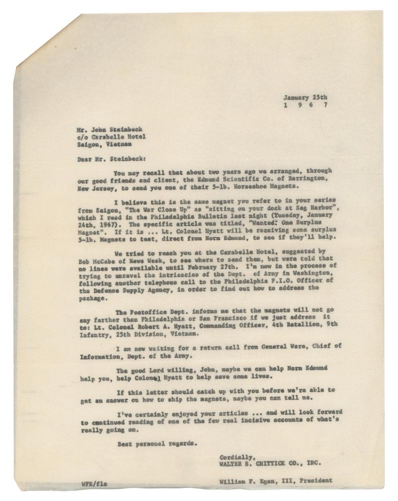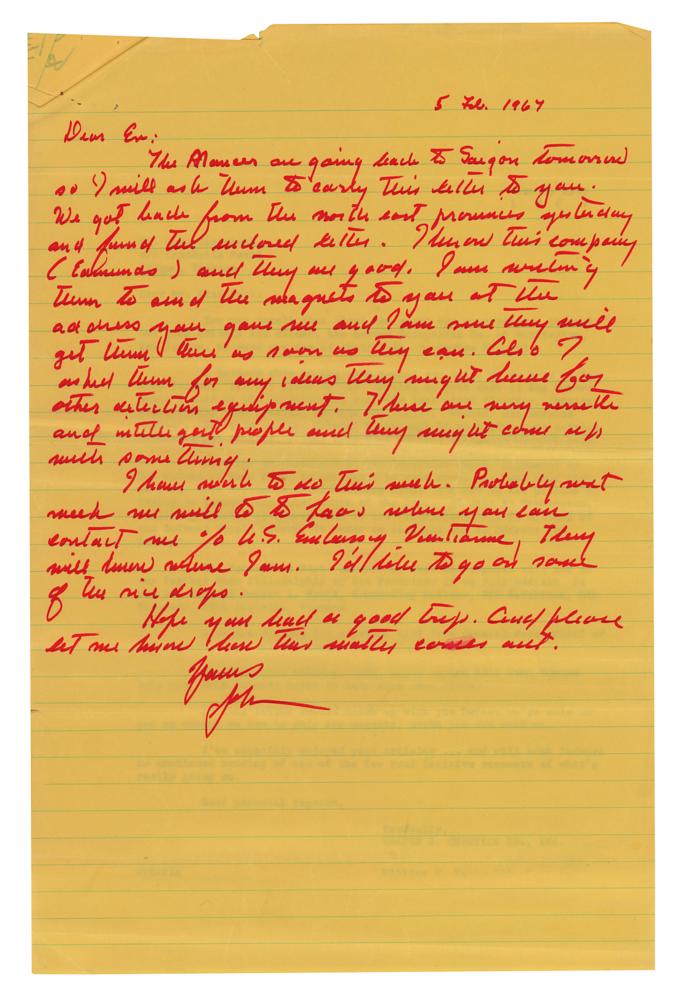 2. ALS signed "John," one page, 8 x 12, February 5, 1967, in part: "We got back from the northeast provinces yesterday and found the enclosed letter. I know this company Edmunds and they are good. I am writing them to send the magnets to you at the address you gave me and I am sure they will get them there as soon as they can. Also I asked them for any ideas they might have for other detection equipment. These are very versatile and intelligent people and they might come up with something. I have work to do this week. Probably next we will go to Laos where you can contact me c/o U.S. Embassy Vientiane. They will know where I am. I’d like to go on some of the rice drops." The January 26th and February 5th letters are stapled together, along with both original mailing envelopes (one addressed in Steinbeck's hand), a carbon copy of a letter to Steinbeck regarding 5-lb horseshoe magnets made by the Edmund Scientific Co., and a photocopy of a letter of introduction for Ev and Linda Martin.